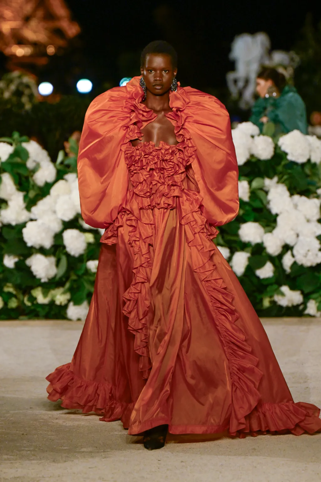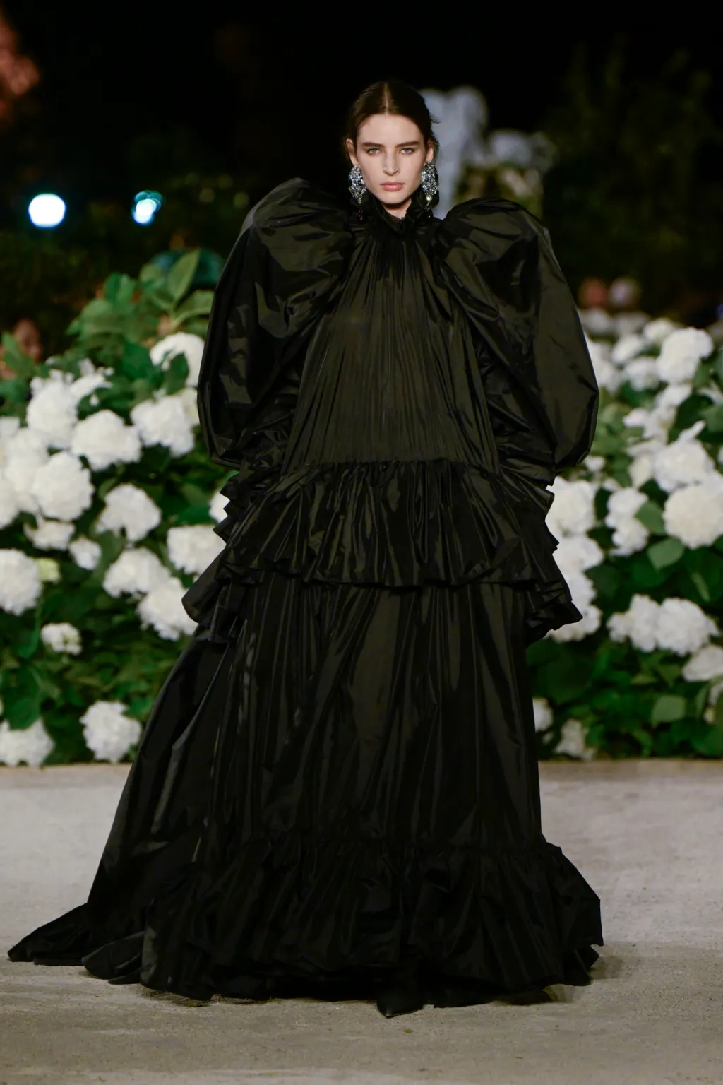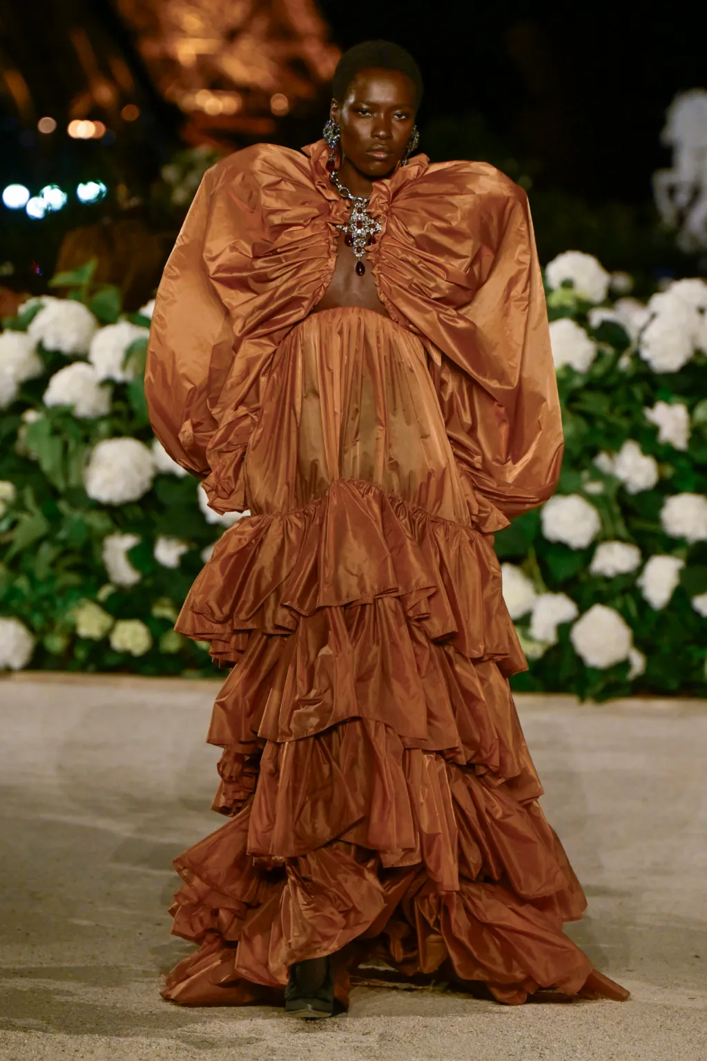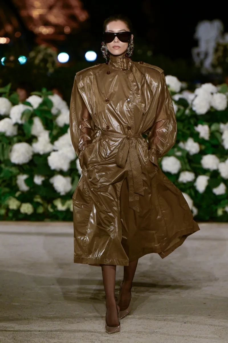 أما البدلات الواسعة والمعاطف الخفيفة المربوطة عند الخصر، فجاءت لتمنح إحساسًا بالحركة بلا قيود، بينما انسابت الأثواب الحريرية الضخمة بألوان هادئة وخطوط درامية على منصة عرض في الهواء الطلق تحت سماء باريس.
