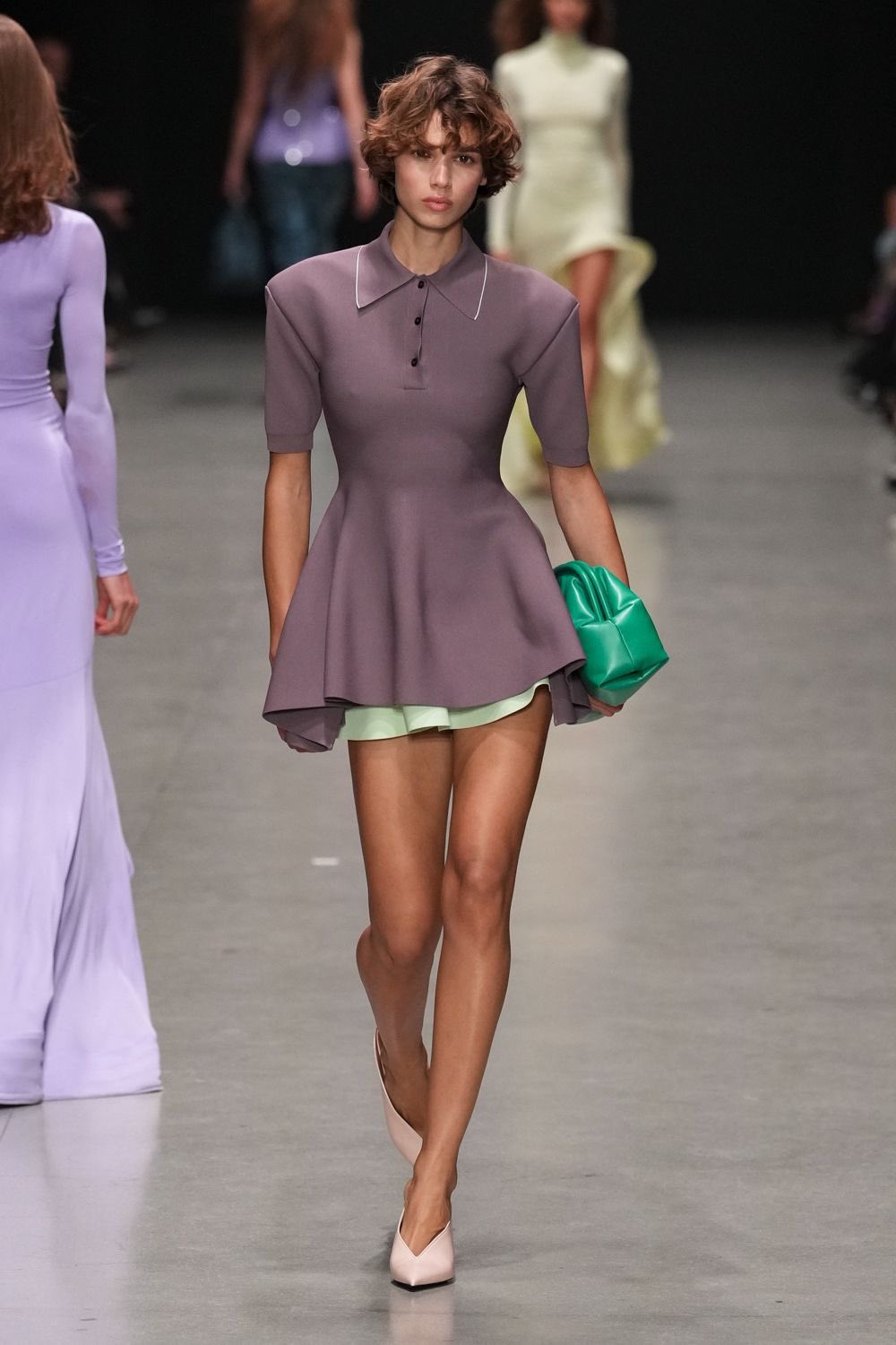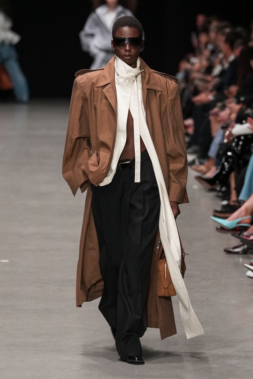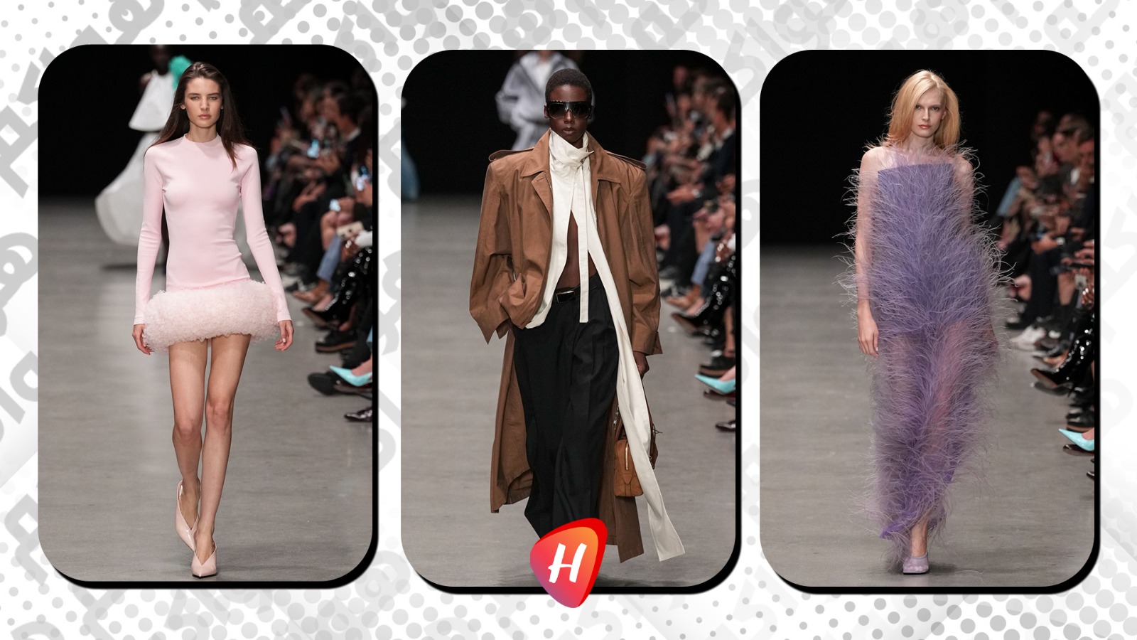 بدلات الأكتاف العريضة بقص جانبي، وقمصان Peplum مع بنطلونات واسعة، وفستان مسدس Draped بأسلوب غريس مع صدريات هندسية تمنح التباين المثالي بين الهيكلية والنعومة.