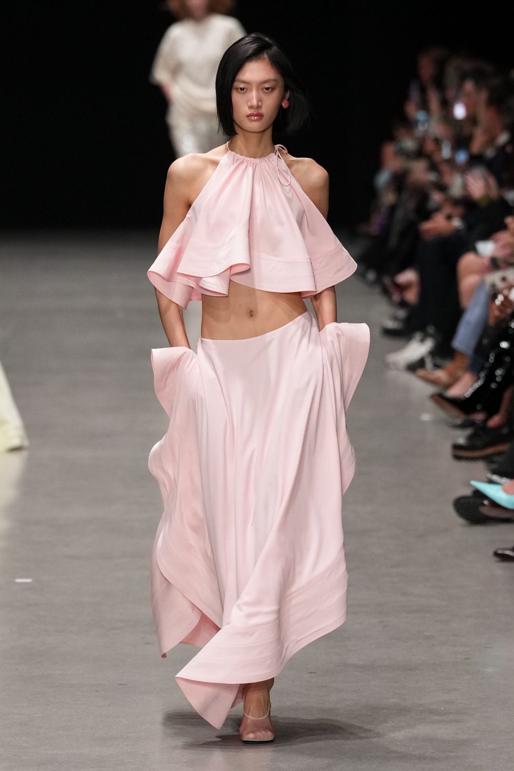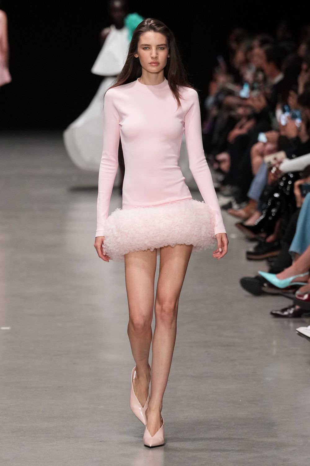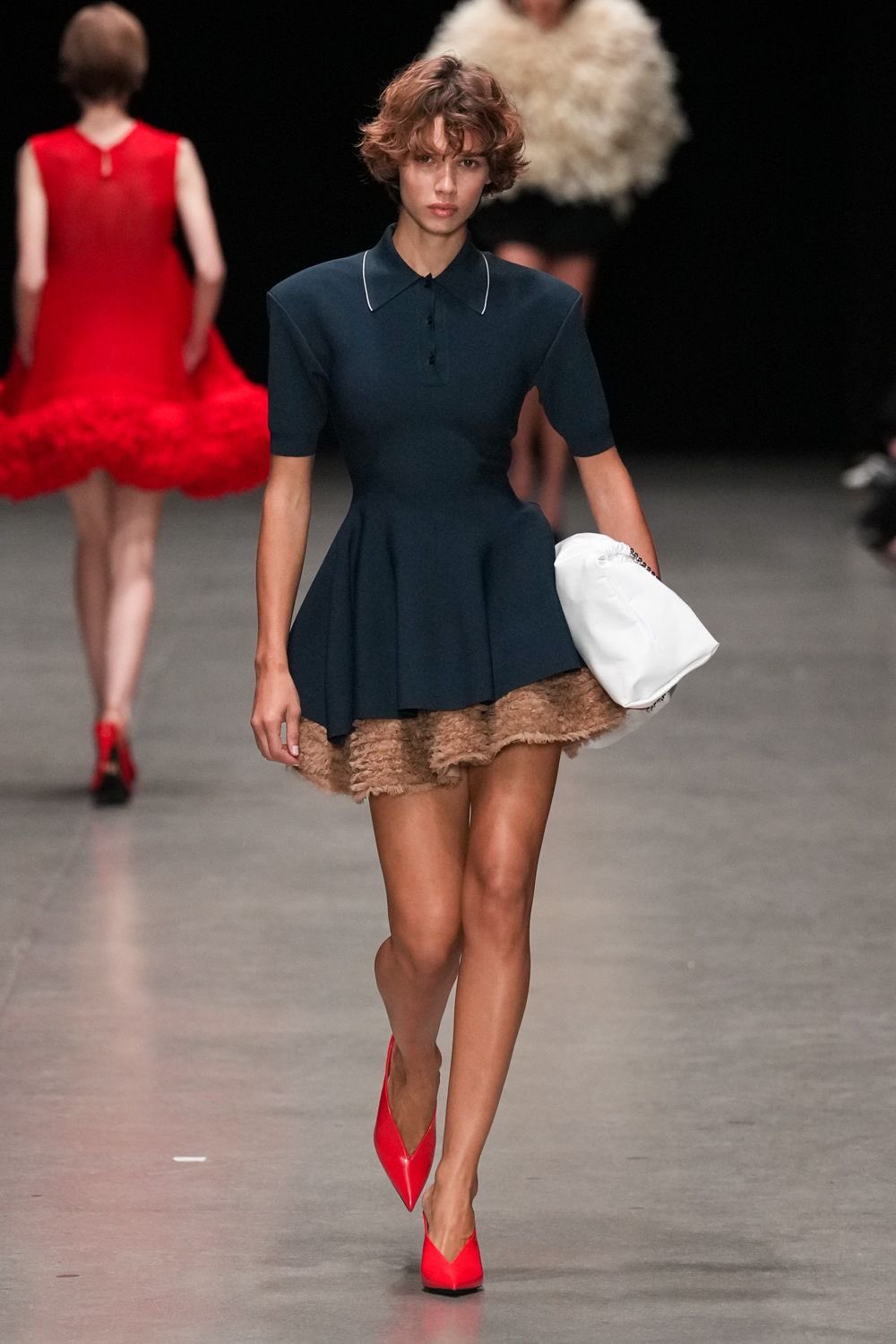 بدلات الأكتاف العريضة بقص جانبي، وقمصان Peplum مع بنطلونات واسعة، وفستان مسدس Draped بأسلوب غريس مع صدريات هندسية تمنح التباين المثالي بين الهيكلية والنعومة.