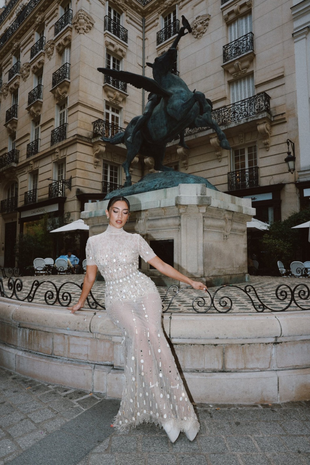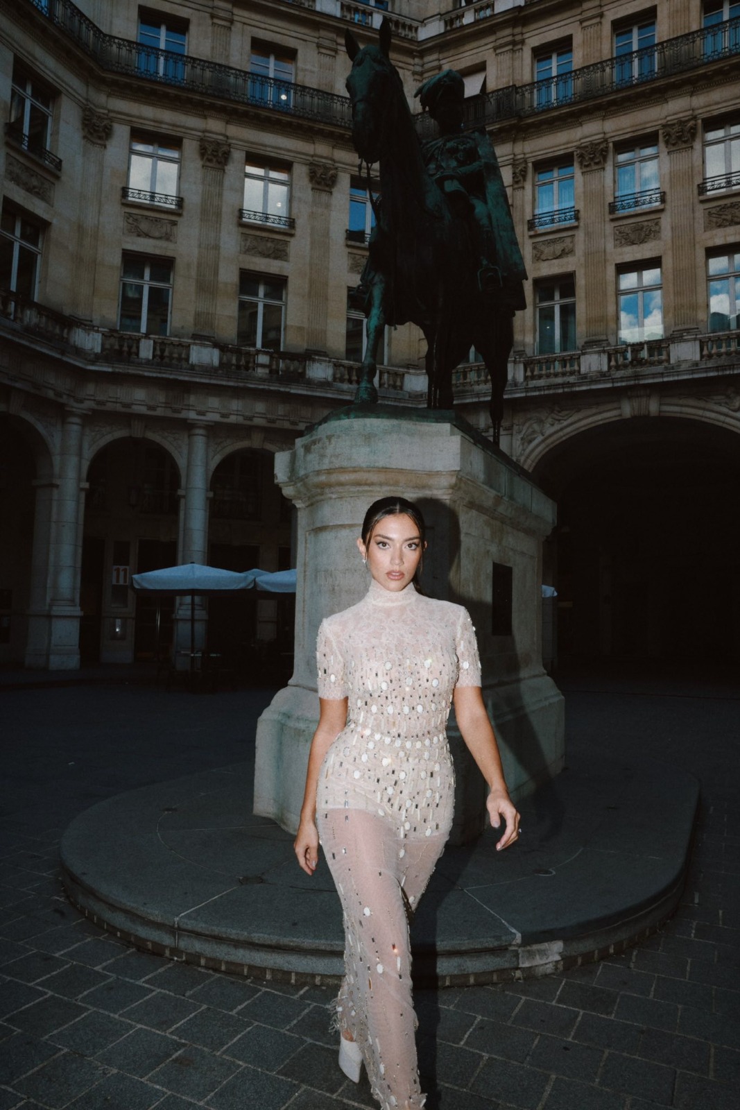 الفستان الرقيق، المنسدل بشفافيته المبطّنة على نصف الجسد، بدا كأنه وشاح ضوء ينساب على ملامحها، يجاور حجارة العمارات الباريسية القديمة، فيخلق ازدواجية بين الأناقة المترفة وقسوة التمثيل التي لا تفارق ملامحها.