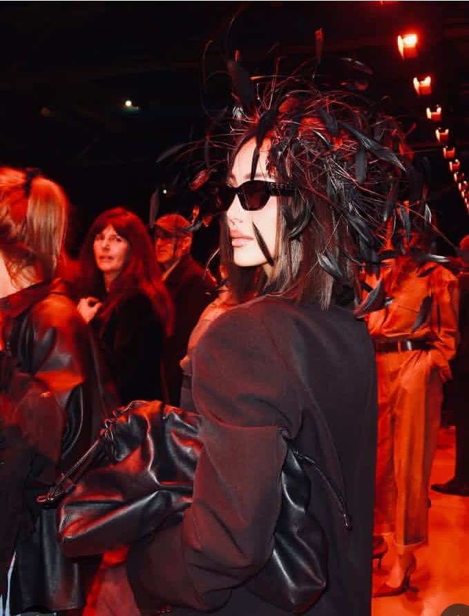 قبعة الريش التي ارتدتها تصريح قوي بأن الإكسسوار قد يصنع هوية فبدت كطائر يحط بين الحضور والغموض يظلله أو كأنها قادمة من مسرح كلاسيكي يعانق المعاصرة. النظارة السوداء العريضة أخفت عينيها، لكنها منحتها بريق الغموض الذي لا يخبو، فيما جاءت القلادة الرقيقة لتهمس بجانب آخر من شخصيتها، ذاك الجانب المرهف الذي يوازن جرأة المشهد.