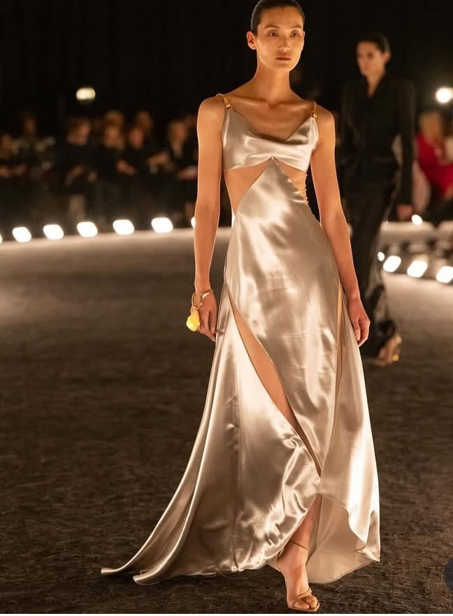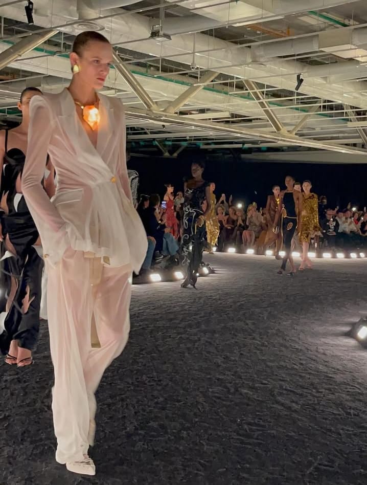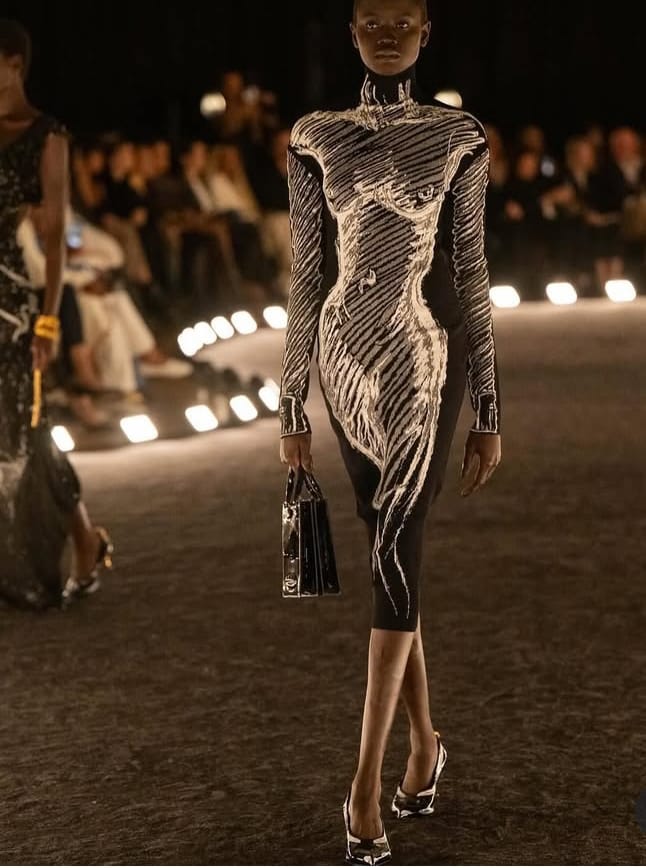 العيون المطرّزة على الصدور، الأكتاف المبالغ فيها، الأقنعة الذهبية، والحلي التي تلتف حول الجسد مثل لغزٍ بصري .هذه التفاصيل جعلت العرض أقرب إلى معرض فني معاصر. إنه خطاب جديد للفخامة، حيث تتحول الموضة إلى أسلوب جمالي يتجاوز حدود اللباس.