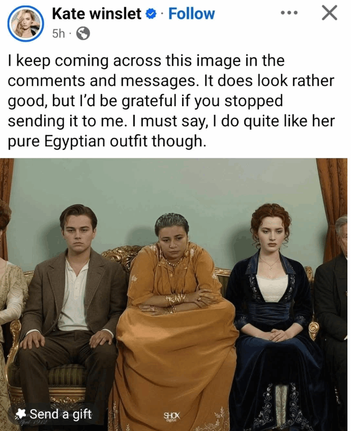 المفاجأة جاءت حين تفاعلت كيت وينسليت نفسها مع الأمر عبر حسابها الرسمي في "فيسبوك"، حيث نشرت الصورة وأبدت استغرابها من تكرار إرسالها إليها في التعليقات على منشوراتها. وكتبت النجمة البريطانية: "أصادف دائماً هذه الصورة في الرسائل، تبدو مضحكة وجيدة نوعاً ما، لكن أرجو منكم التوقف عن إرسالها، ومع ذلك أعجبتني ملابسها المصرية".