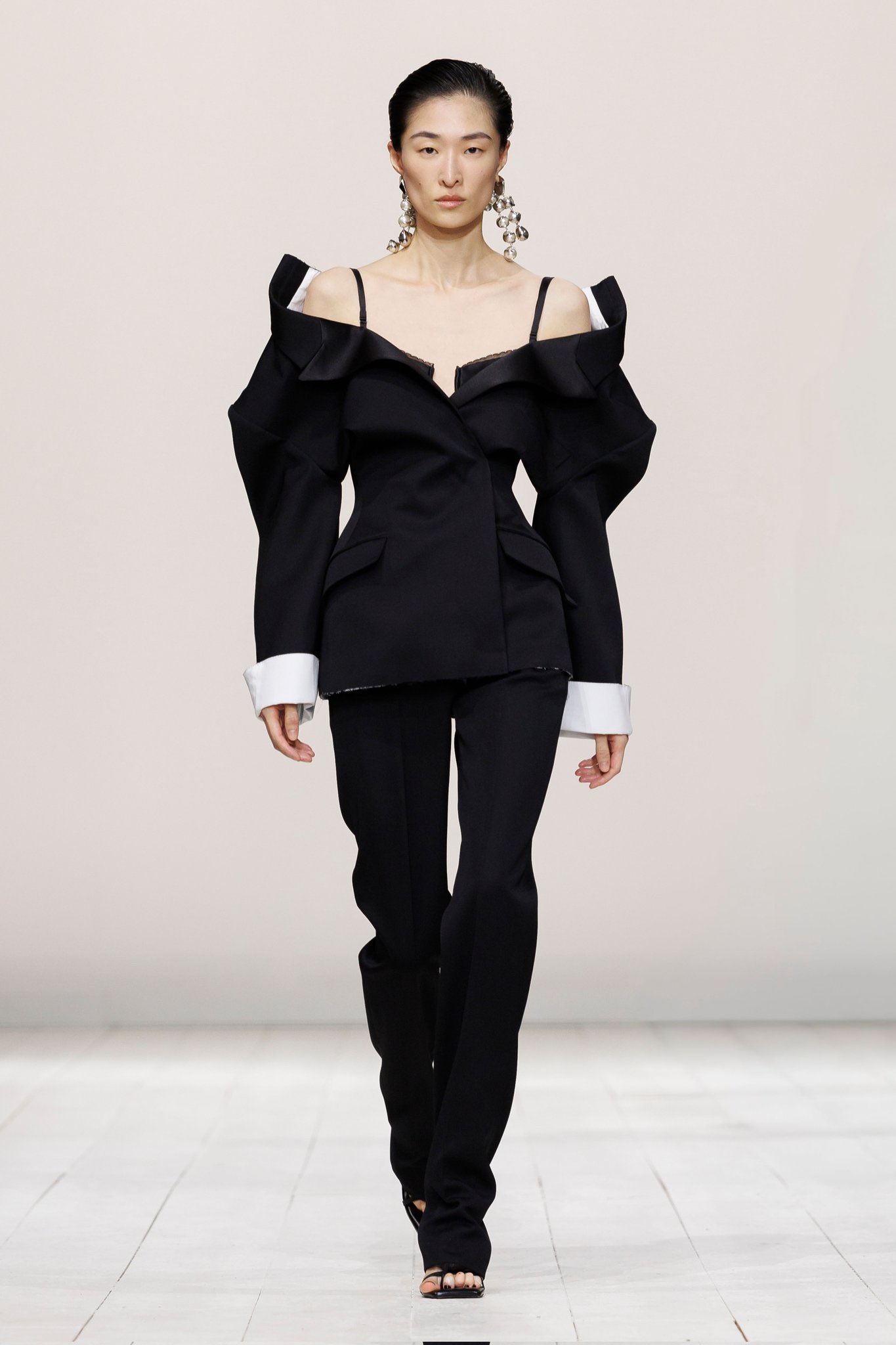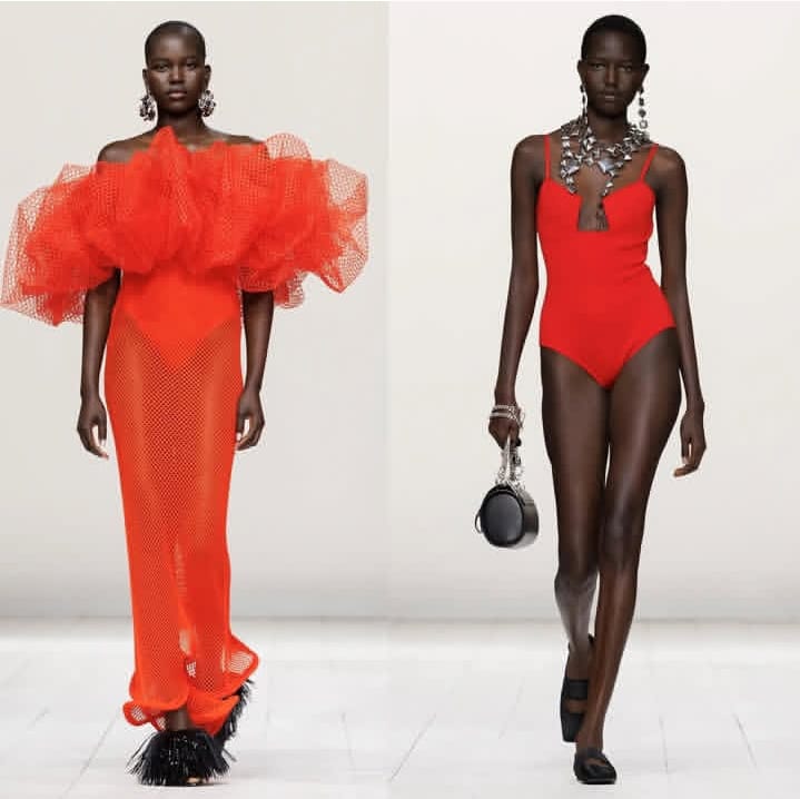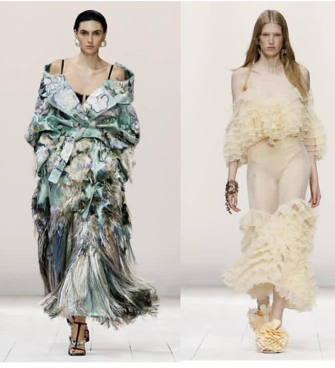 القصّات حملت توقيع جيڤنشي الواضح: سترات حادة الكتف تلتقي مع فساتين حريرية شفافة، تعانق الجسد دون أن تقيّده، وبذلات واسعة بانسيابية رشيقة تعكس رؤية الدار للمرأة ككائن حرّ يوازن بين الصرامة والرقة.