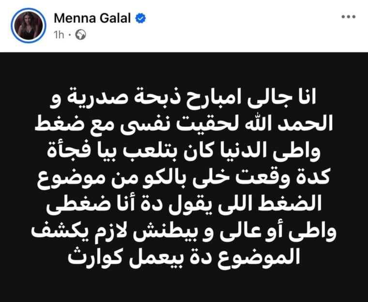 فاجأت الفنانة المصرية منة جلال جمهورها بإعلان تعرضها لذبحة صدرية نتيجة هبوط مفاجئ في ضغط الدم، في واقعة أثارت قلق محبيها ومتابعيها عبر مواقع التواصل الاجتماعي.