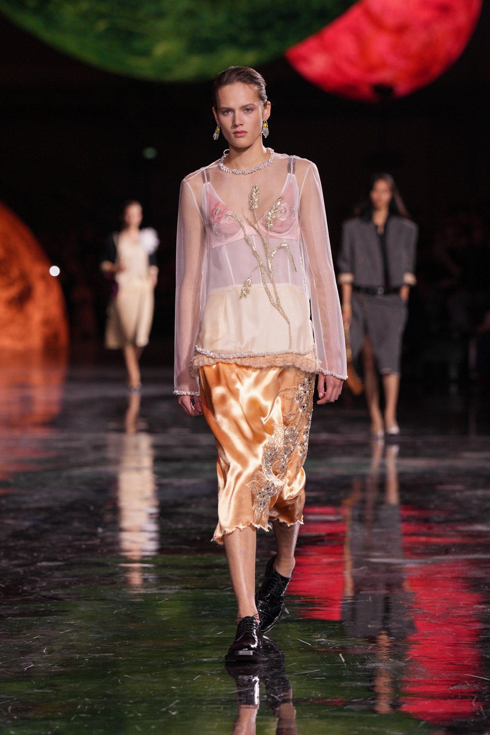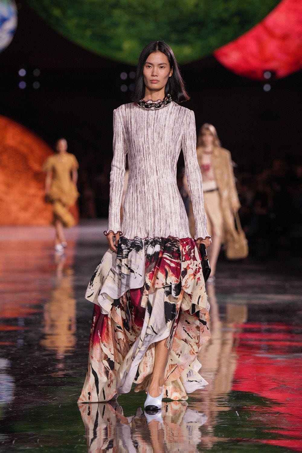 جاءت التصاميم بخطوط ناعمة وفساتين بخصر منخفض أعادت وهج الأنوثة الكلاسيكية، إلى جانب قمصان طويلة مزرّرة وأطقم تويد مستوحاة من أرشيف الدار، لكن بلمسات معاصرة مثل الأطراف المهترئة والقصّات الممدودة التي أضفت حيوية عصرية على الإطلالات.