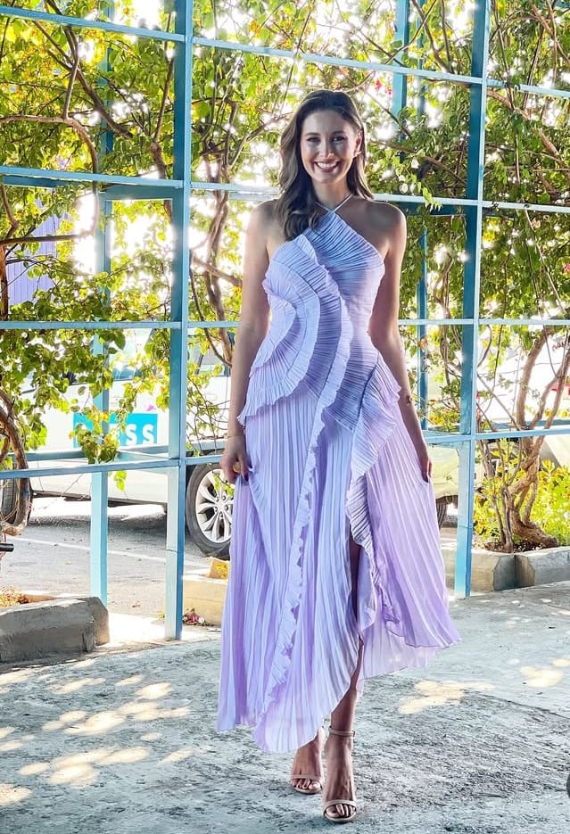 اختارت ثوبًا صيفيًا باللون اللافندر، لون الهدوء والأنوثة المترفَة، بتصميمٍ مرح من قماشٍ ناعمٍ مكسر يعانق الجسد بخفة ويكشف عن كتفين عاريين كأنهما وعدٌ بالانطلاق من قيود الألقاب إلى أفق المرأة الحقيقية.