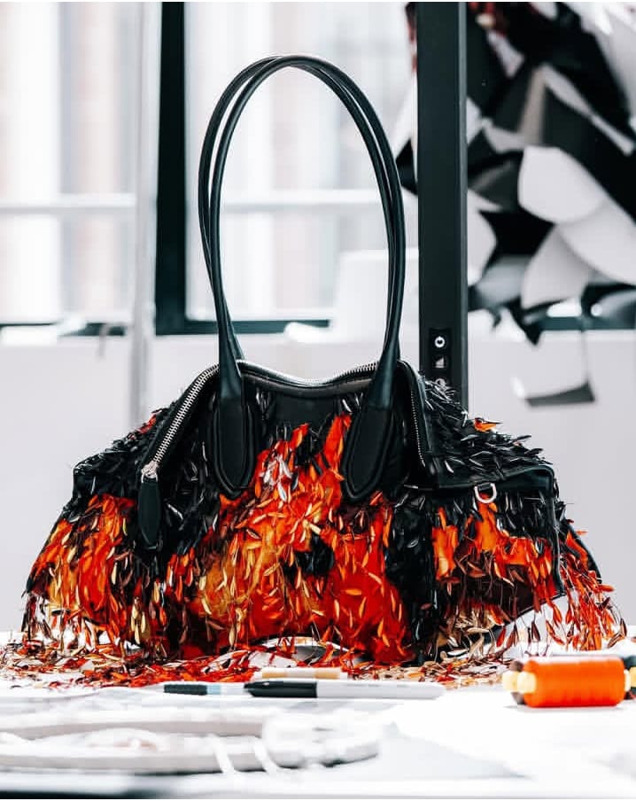 الحقائب جاءت بأشكال هندسية صارمة، تُكسرها شراريب طويلة تتدلّى كأنها خيوط حريرٍ خرجت من عاصفة. بعضها بدا ككتلة من اللهب تتوهّج بالأحمر والبرتقالي، وبعضها كظلّ أسود غارق في الغموض. وبعضها أبيض وفي جميعها، تختبئ روح الدار التي تعرف كيف تمزج بين الرهافة والتمرّد.