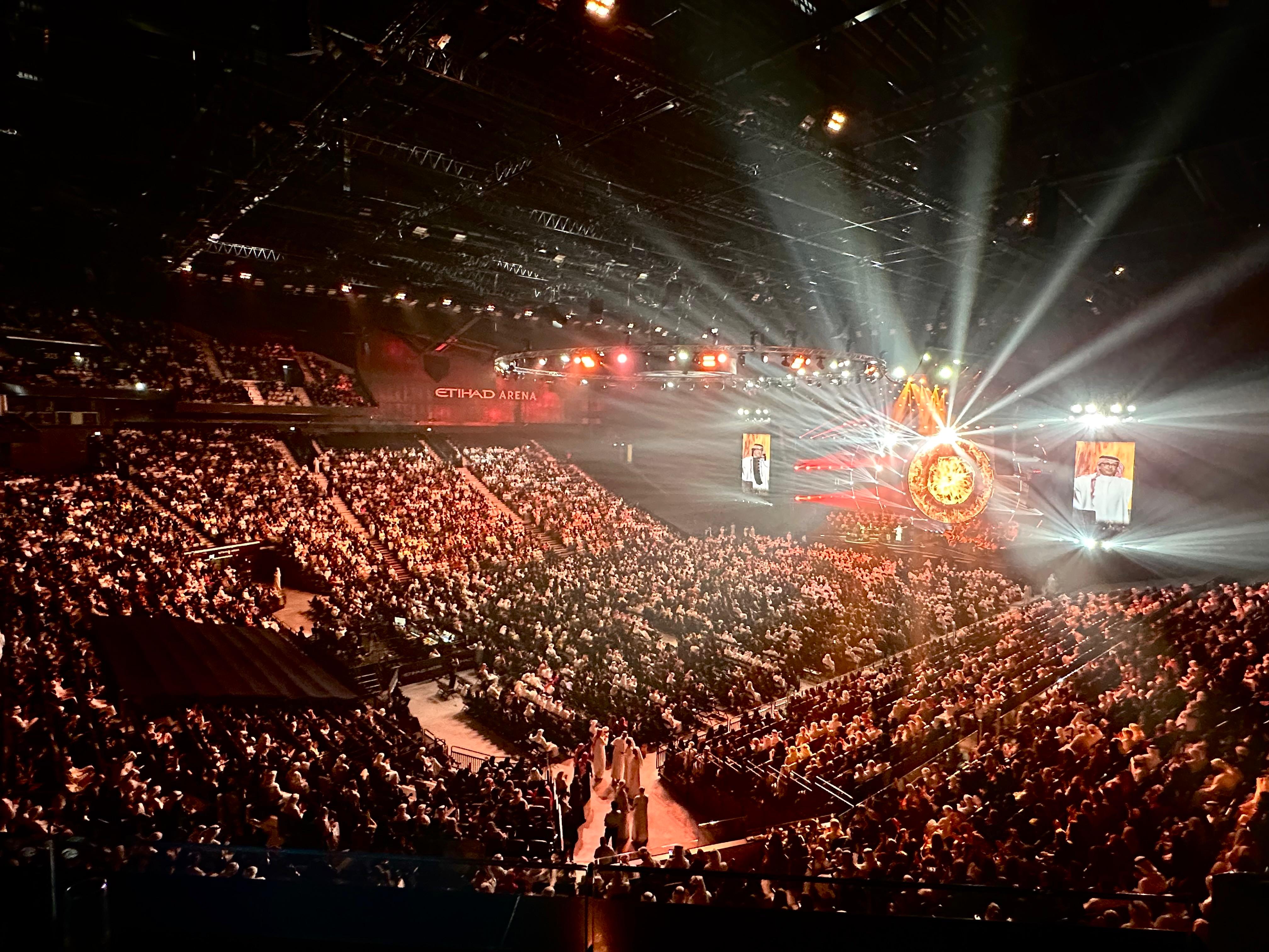 على الفور، قدّم النجم الخليجي التهنئة للحضور قائلاً: "يا الإمارات مالكم حل"، واحتفل معهم بأغنية "فزّي له" التي تحولت إلى لحظة فرح جماعي في القاعة.