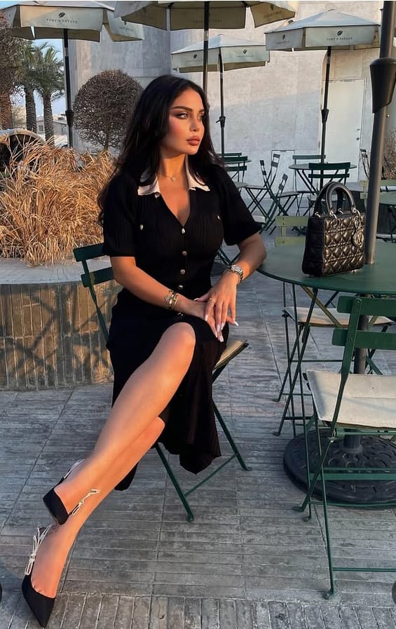 تظهر زينب فياض في هذه الإطلالة بفستان أسود أنيق ذي ياقة بيضاء كلاسيكية، جلست بكامل توازنها وأناقتها تحت شمس الغروب، تفيض ثقةً وهدوءً. الأسود جاء راقياً ومنحوتاً. وحقيبتها الفاخرة أضافت لمسة من فخامةٍ هادئة، تؤكد أن البساطة حين تُتقن تتحوّل إلى رفاهٍ بصريّ.