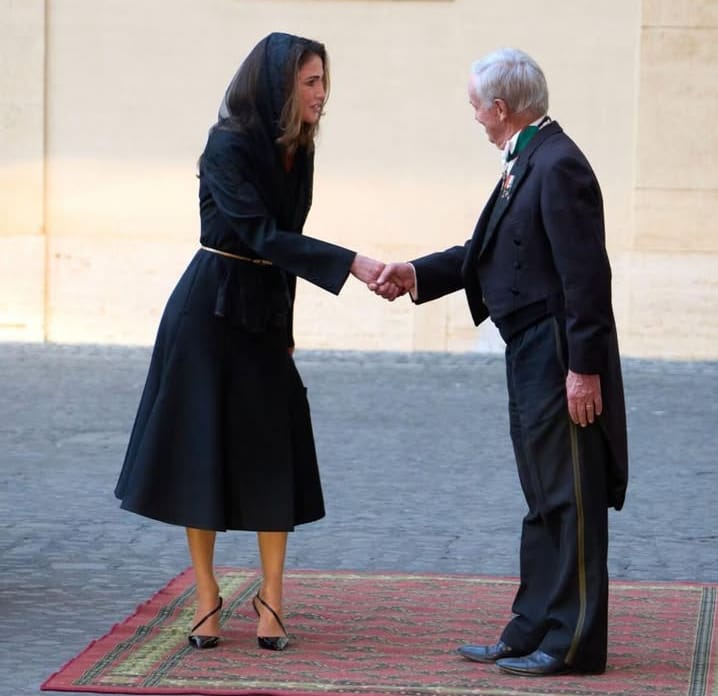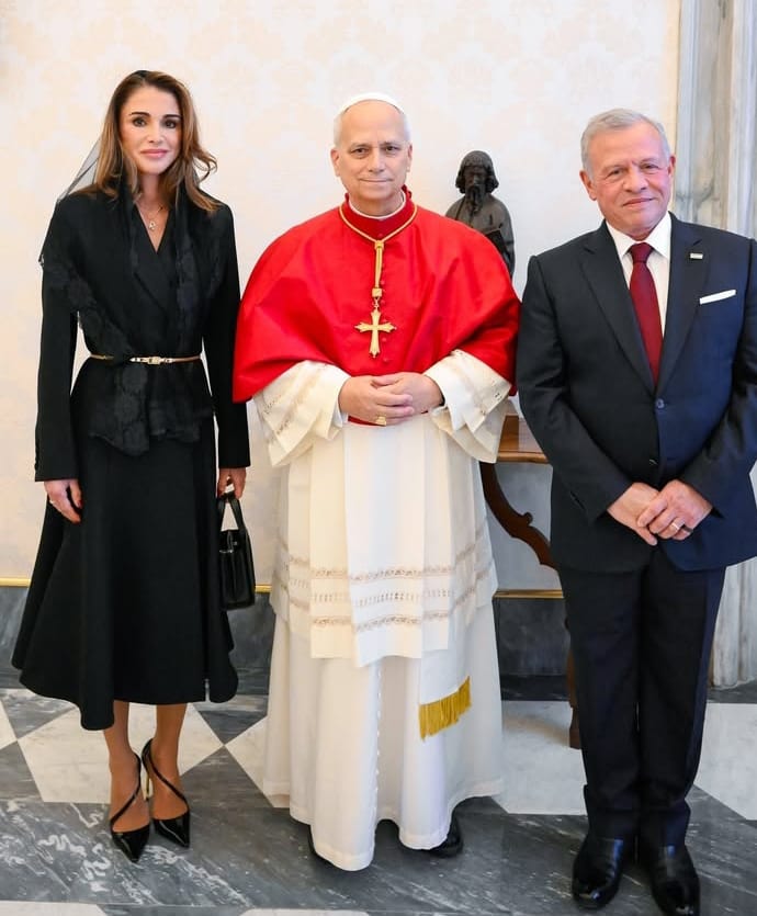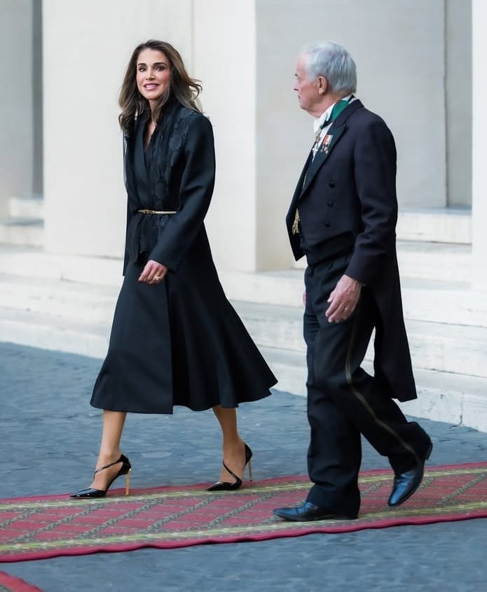 أطلّت الملكة رانيا العبدالله بإطلالة سوداء تفيض وقارًا وأناقة في زيارة رسمية إلى الفاتيكان برفقة جلالة الملك عبدالله الثاني للقاء قداسة البابا .
