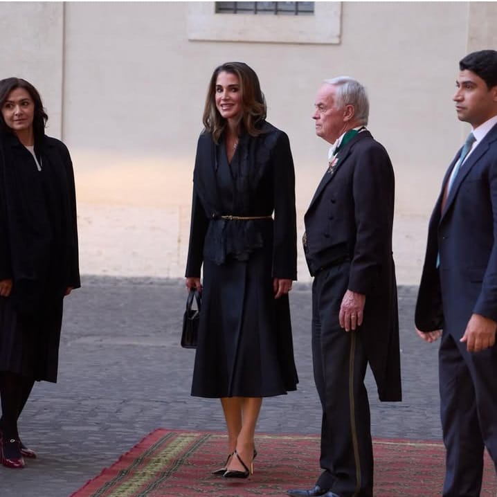 في هذه الإطلالة الانيقة والرصينة عبّرت الملكة من خلالها عن لغة ديبلوماسية ناعمة، تزاوج بين الهيبة والتواضع، وبين رمزية اللون الأسود كدليل احترامٍ ومهابة، ورقّة التفاصيل التي تعكس جوهرها الإنساني الهادئ.