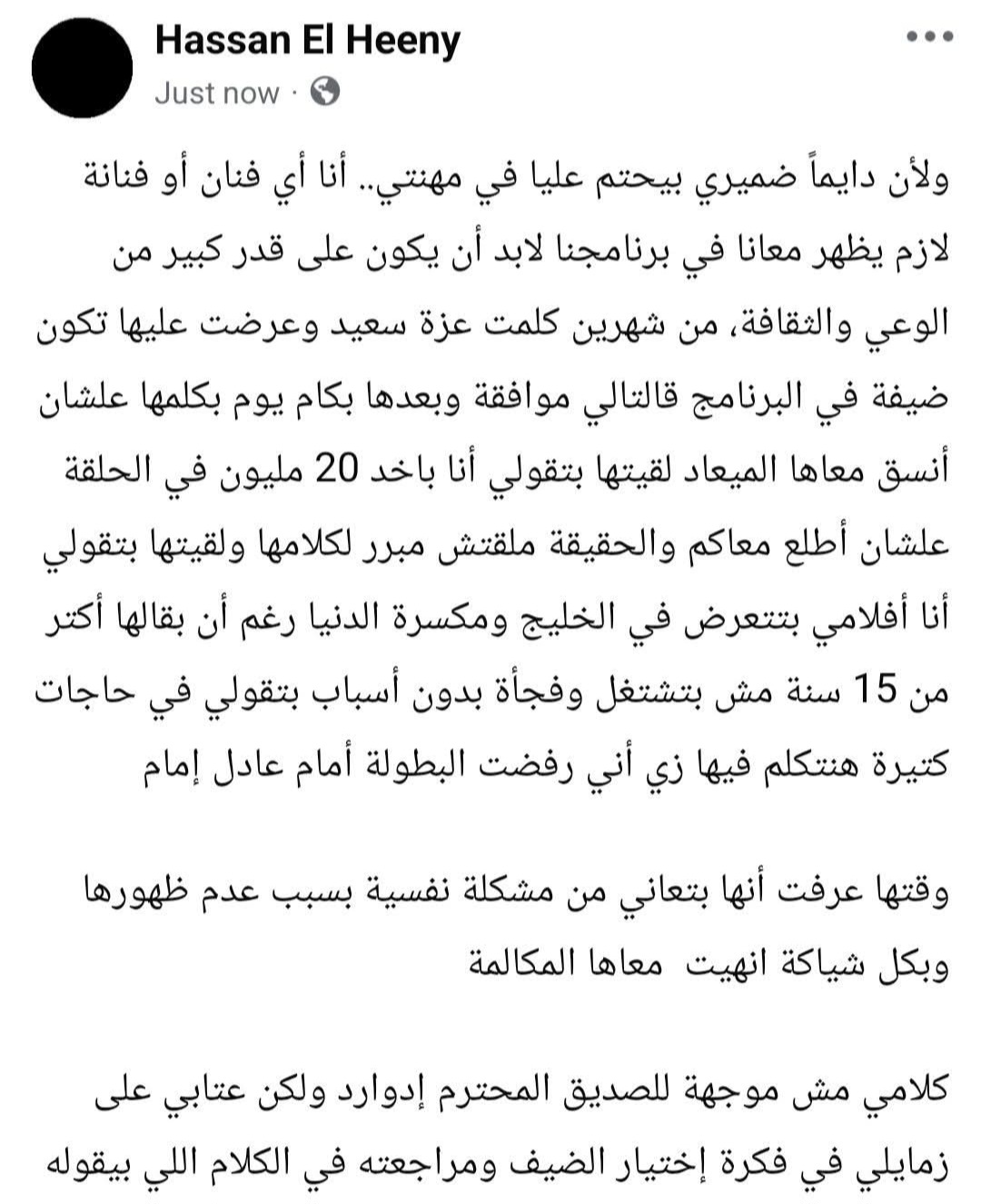 من جانبه، علّق الإعلامي حسن الهيني، أحد معدّي البرامج، مؤكدًا أنه تواصل سابقًا مع عزة سعيد ولاحظ حالتها النفسية، قائلاً: