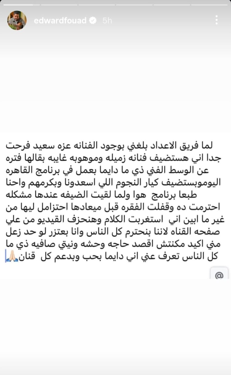 قدّم الفنان إدوارد اعتذاراً رسمياً لجمهوره بعد الجدل الكبير الذي أثارته حلقة الفنانة عزة سعيد في برنامجه "القاهرة اليوم". وأعلن إدوارد حذف الحلقة من جميع المنصات احتراماً لمشاعر المشاهدين، مؤكداً أن ما جرى خلال البث لم يكن مقصوداً.