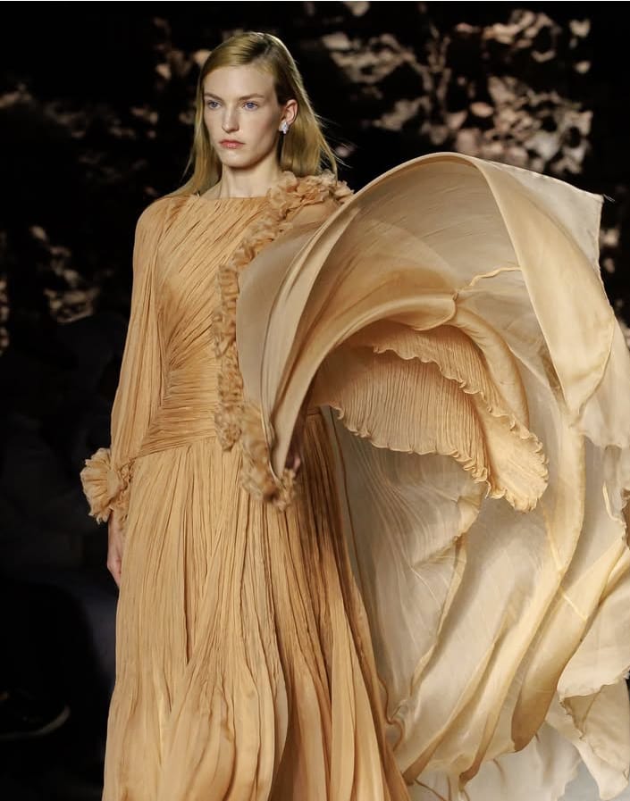 تناثر الورد قماشاً على منصة عرض أسبوع الموضة في الرياض.