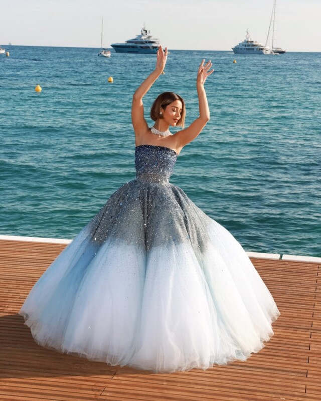 في مهرجان كان السينمائي 2025، تألقت بلقيس بفستانٍ أزرق بتدرجات البحر والسماء، من توقيع أوسكار دي لارينتا، منسّقاً بلمسات خبير الموضة سيدريك حداد.