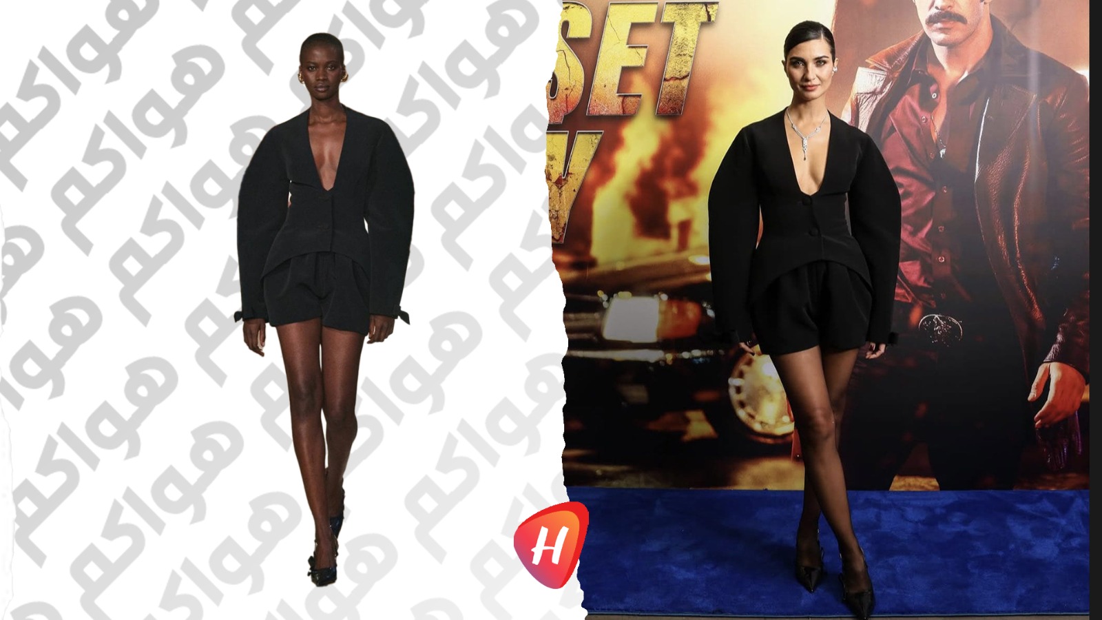 الفستان القصير جاء بقصّة مبتكرة تحاكي فن العمارة في الأزياء، حيث اتّخذ الجزء العلوي شكل جاكيت بأكتاف بارزة وأكمام ممتدّة، ما منح الإطلالة حضوراً درامياً يليق بخطّ السجادة الزرقاء للفيلم. أما الشورت القصير المضمّن في التصميم، فمزج بين العملية والأناقة، مؤكداً أسلوب توبا العصري الذي لا يخشى التناقضات.