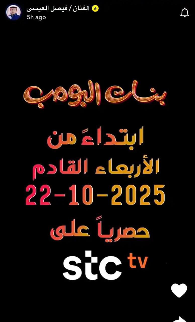 نشر فيصل العيسى على حسابه في "سناب شات" ستوري، معلناً يوم غد الأربعاء 22 أكتوبر/تشرين الأول موعداً لبدء عرض مسلسل "بنات البومب"، حصريا على STC