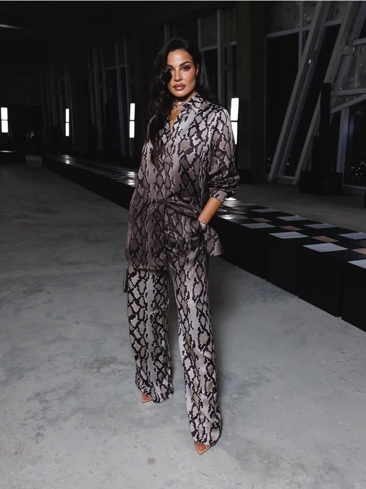 بدلة ناعمة أقرب إلى الحلم، مؤلفة من بنطال واسع وقميص فضفاض بلونٍ يميل إلى تدرجات البني والبيج، مرقّط بخطوط تشبه أثر الريح على الرمال، تمنح الناظرين إحساسًا بالسكينة والحرية في آنٍ واحد.