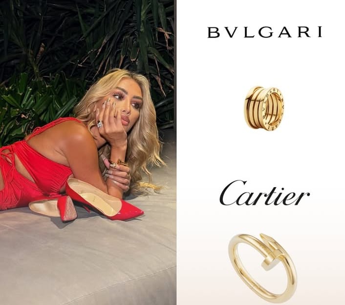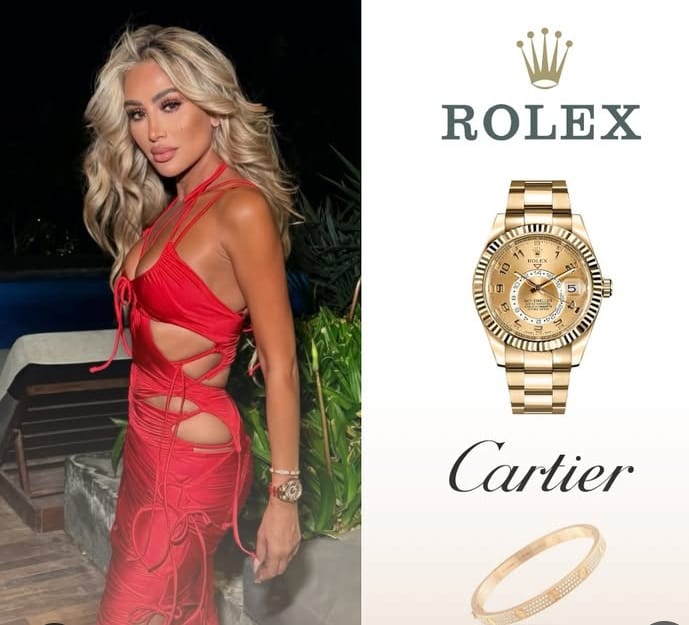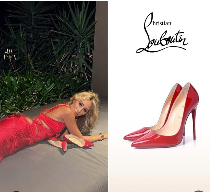 أكملت مايا الصورة بتفاصيلها الفاخرة: ساعة رولكس براقة، مجوهرات من Cartier وBvlgari تتوزّع كحروف ترفٍ على البشرة، وحذاء أحمر من Christian Louboutin يوقّع الخطوة بالجرأة ذاتها.