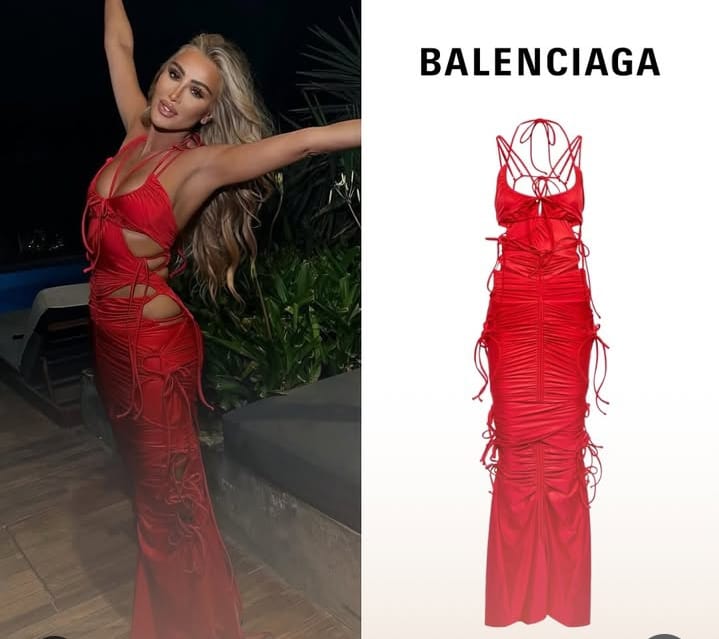 فستان أحمر مخرّم عند الجذع، بخيوط دقيقة تلتفّ حول الجسد مثل أسرارٍ تُقال همسًا، وطياتٍ لا تهدأ تشدّ القوام وتمنحه ذلك التوتر المحبّب بين الجمال والخطر.