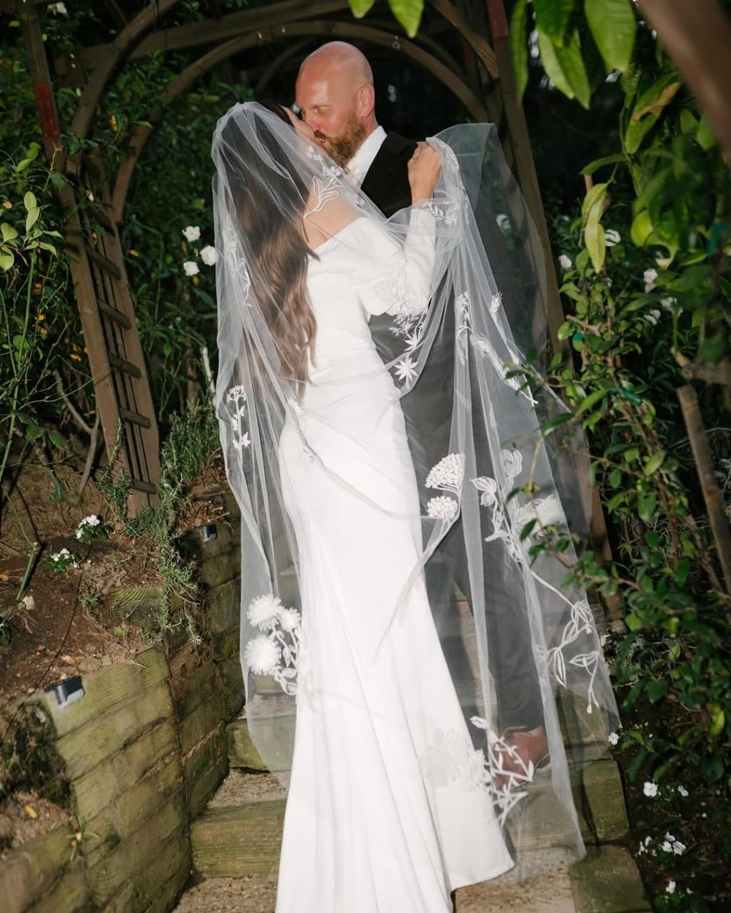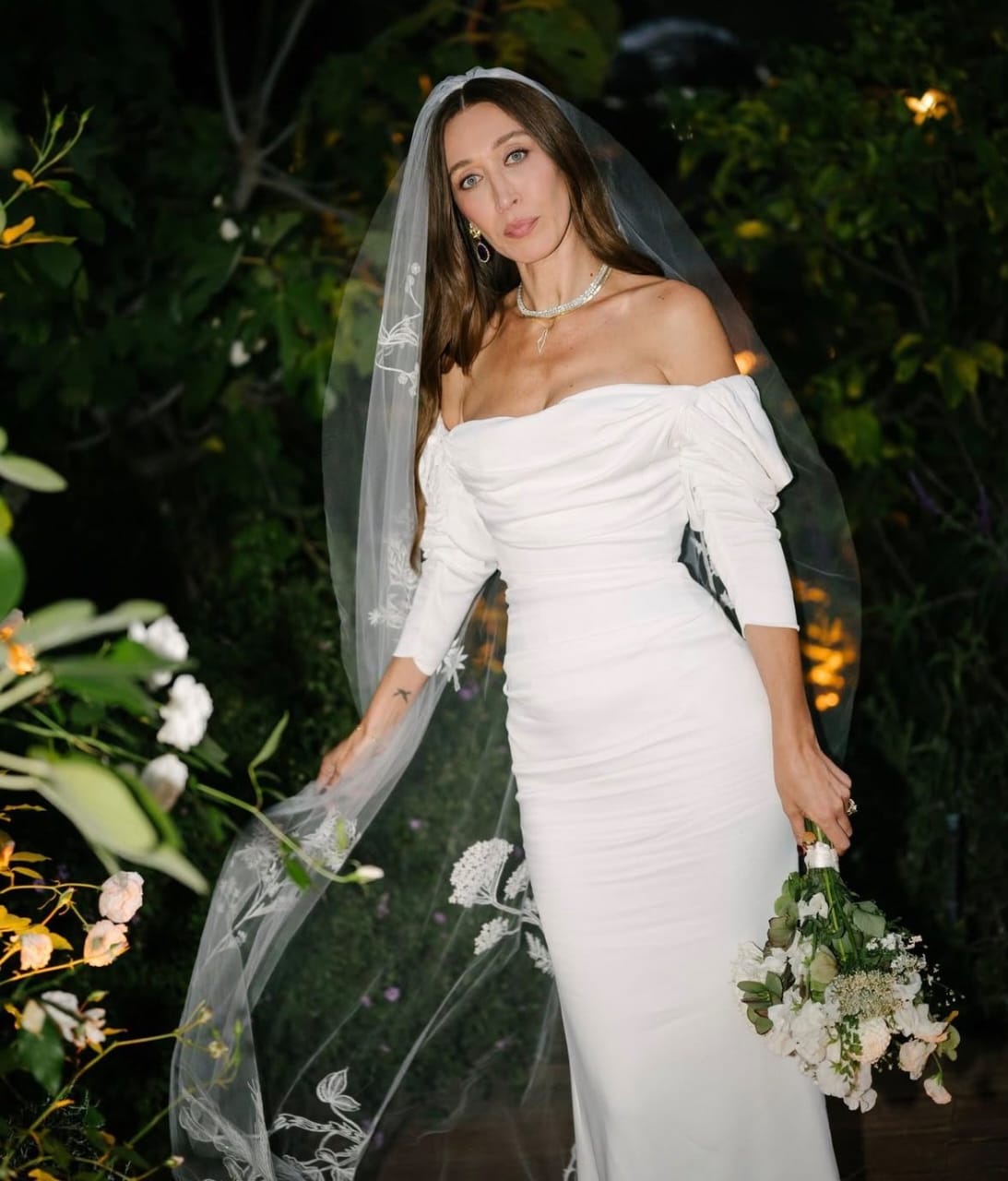 الأكمام الطويلة جاءت على شكل طبقة منفصلة، ما أضفى توازنًا بصريًا ورومانسية على الإطلالة. الطرحة الطويلة الشفافة والمطرزة يدويًا بأزهار برية صغيرة، نسّقت بدقة مع طبيعة الحفل، لتبدو وكأنها امتداد للحديقة المحيطة.