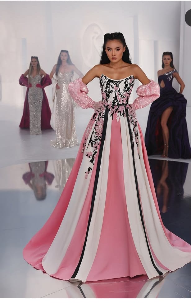 هذه التصاميم كأنها صممت لتلتقي بالسجادة الحمراء أو بروح القصور، أو والأنوثة المتطلبة .شغف التفاصيل في الاثواب يولد مشهد من الرفعة والجمال يصعب نسيانه.