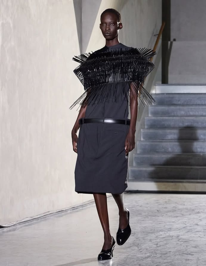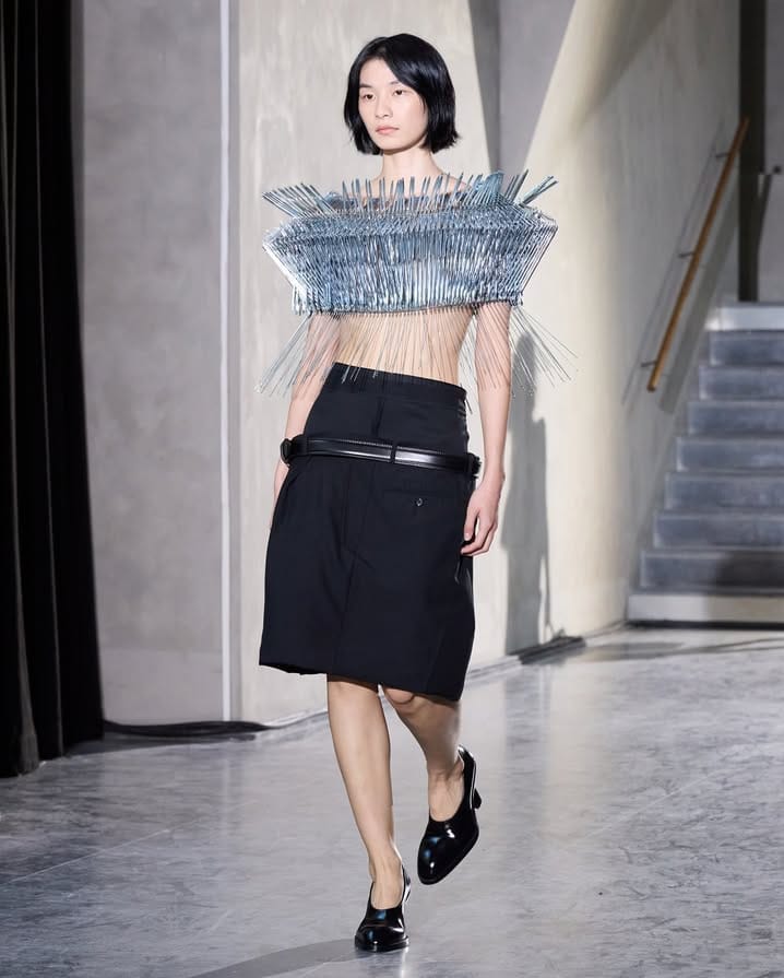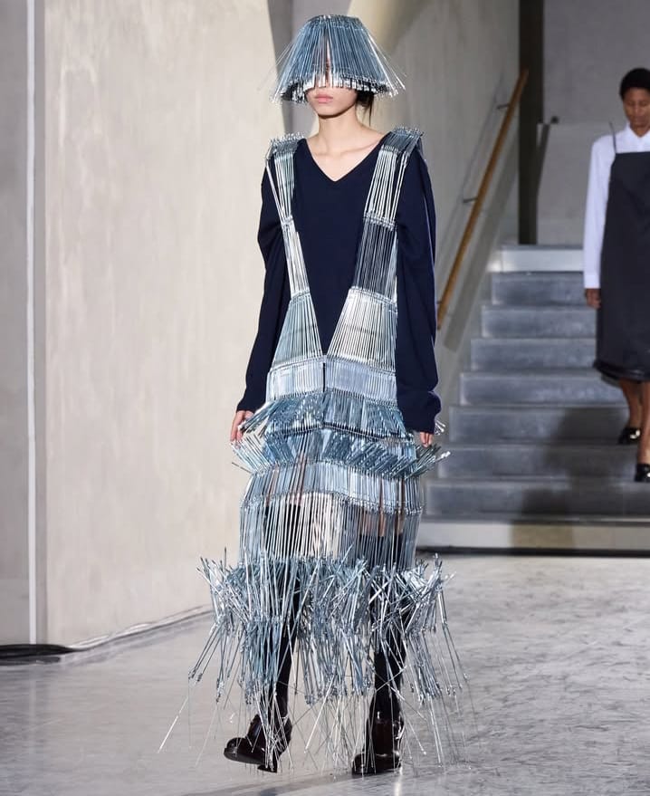 أثواب من أضلاع المظلّة (umbrella ribs / steel ribs) تحوّلت إلى قفصٍ معدنيّ يحيط بالكتف والصدر، أحيانًا كعقدٍ مجسّم أو كقبةٍ قصيرة تشبه التاج؛ وفي إطلالاتٍ أخرى صارت شُرائحٍ متدلية تشبه الشُعور المعدنية. بات الجسد محاط بقفص معدني يضفي صليلاً اثناء المشي.