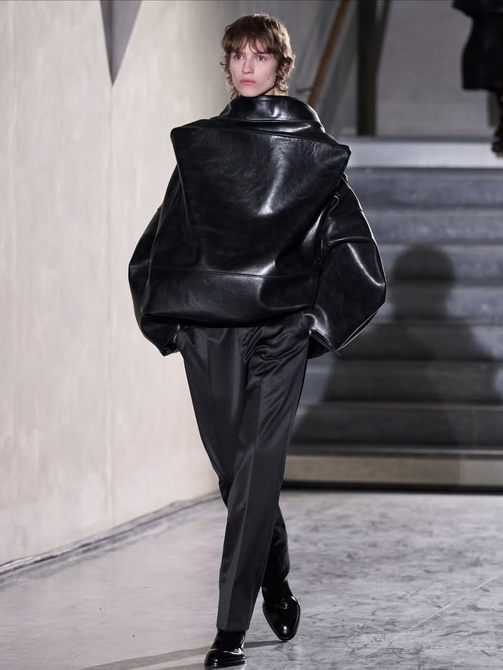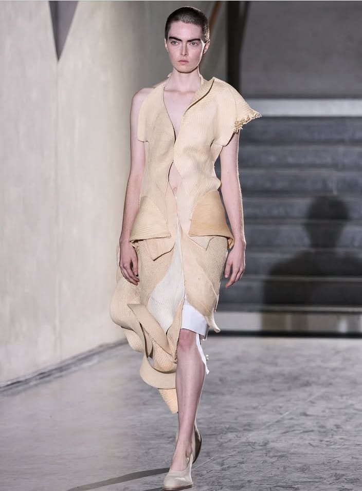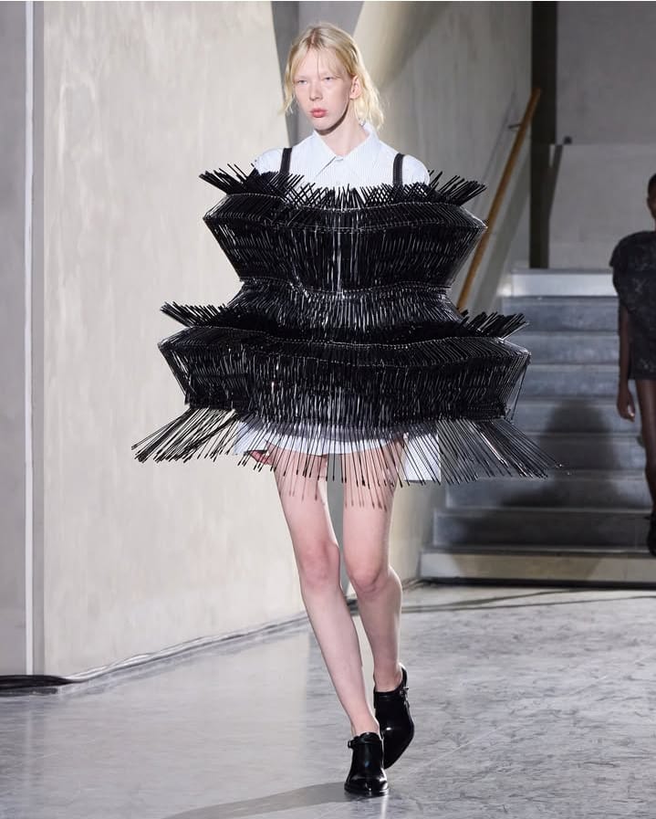 وبين ابتكار المعدن وتحويله الى اشكال هناك فساتينٍ ناعمة من أقمشة بيضاء مطوية مثل وسائدٍ إلى قطعٍ هندسيةٍ صلبة تحيط بالجسم كأكياس وطبقاتٍ تبدو وكأنها «قطع أثاث جلدية» مُعاد تشكيلها، وجاكيتات ترتطم بالهواء كأجنحة .