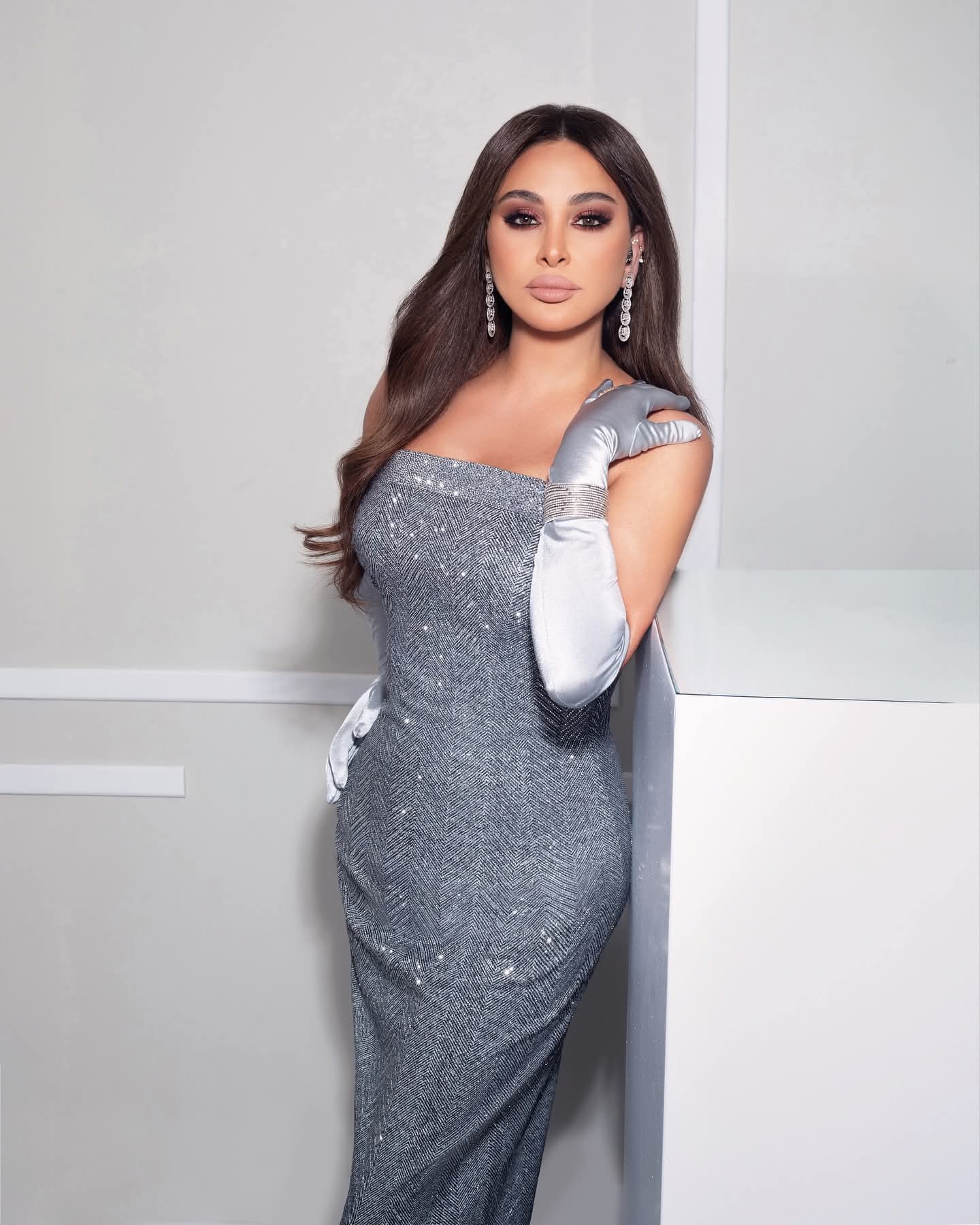 ارتدت فستاناً رمادياً لامعاً من توقيع Ermanno Scervino، صُمّم كخطّ رشيق ينساب على الجسد كأنّه قصيدة من الضوء. جاءت قصّته cut عند الصدر بجرأةٍ محسوبة، تعكس ثقة أنثى تعرف أين تضع بريقها.