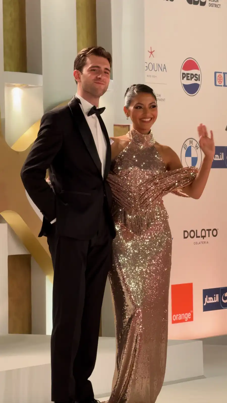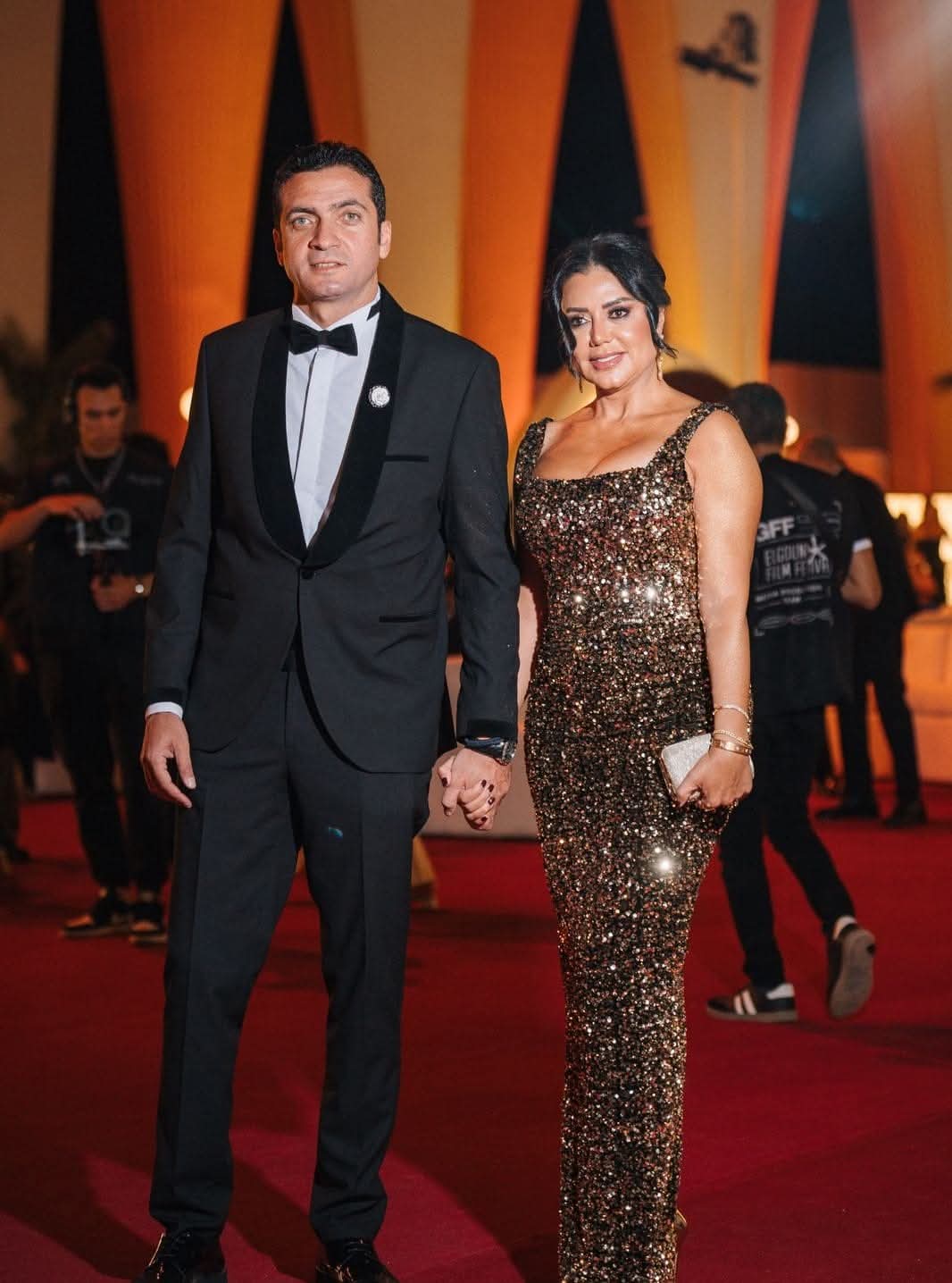 ارتدت رانيا فستانًا ذهبيًا لامعًا بالكامل بتطريزات من الباييت البرّاق الذي عكس الأضواء بطريقة ساحرة على السجادة الحمراء. أما المخرج أحمد جمال، فاختار بدلة سوداء كلاسيكية بياقة مخملية وربطة عنق أنيقة، ليشكّلا معًا ثنائيًا لافتًا بأناقة متناغمة في ليلة الختام.