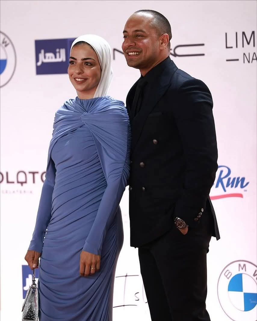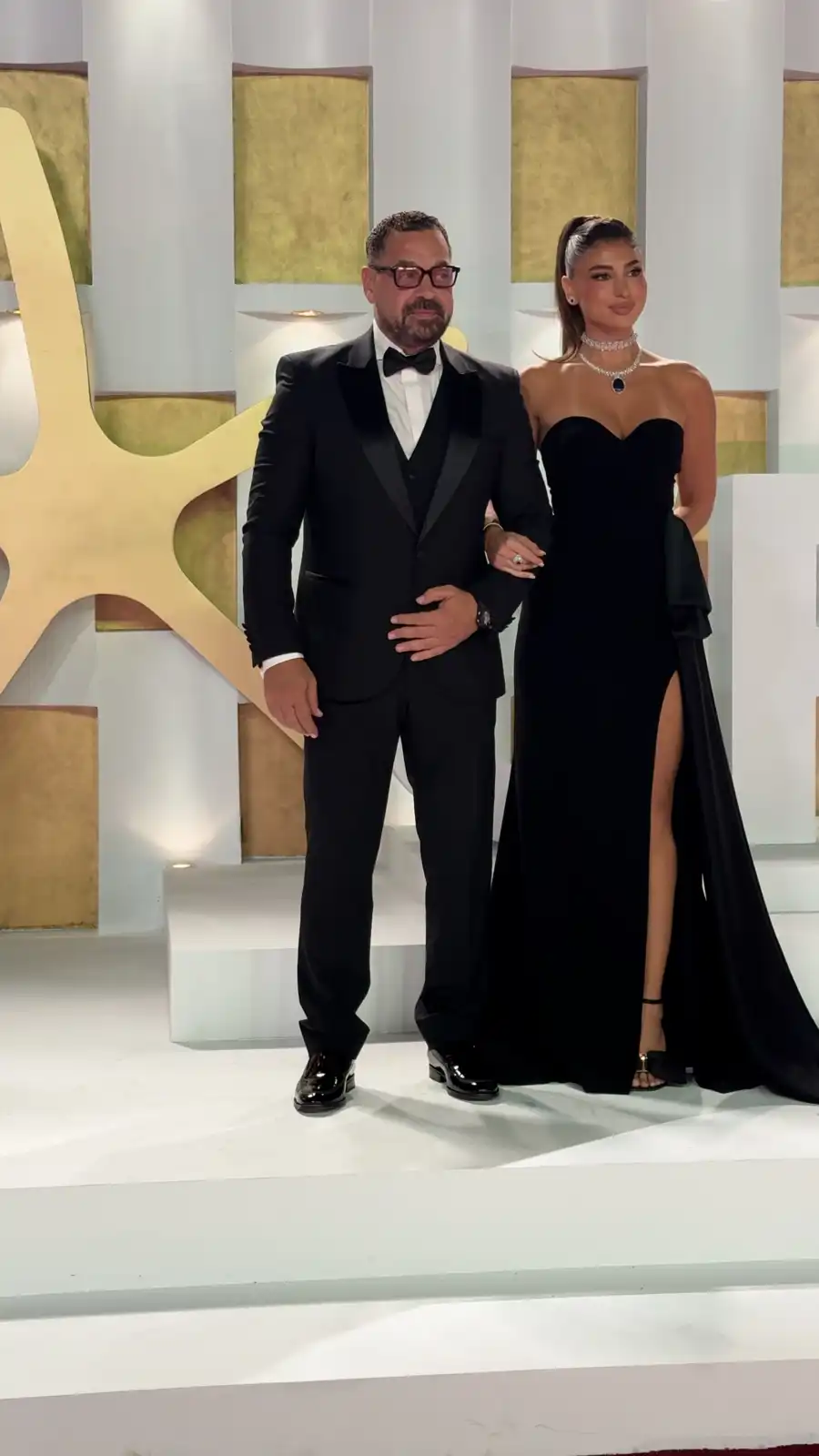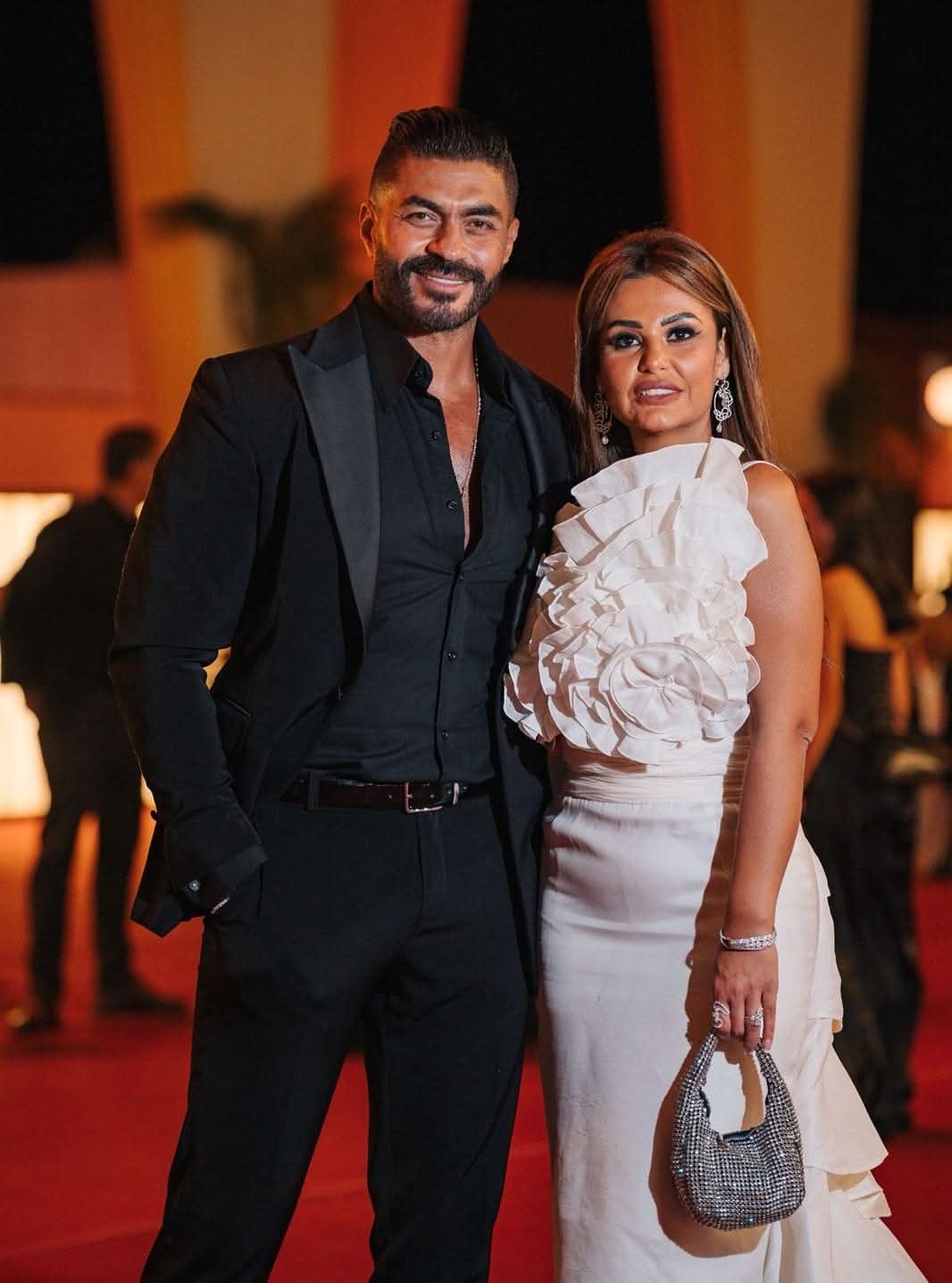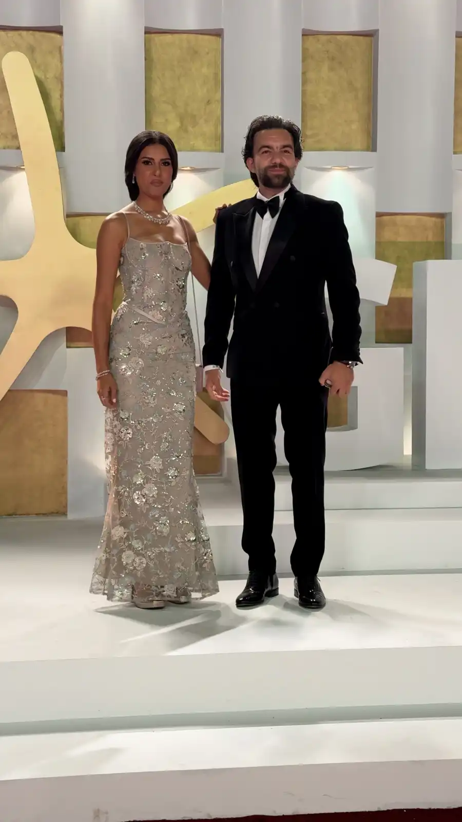 لفت الثنائي الأنظار على السجادة الحمراء بتناسق لافت في الإطلالة، إذ تألّق شريف ببدلة سوداء كلاسيكية، فيما ظهرت زوجته بفستان فضي مطرّز بالورود اللامعة بقصّة انسيابية ومجوهرات راقية زادت من بريقها، ليبدوا كأحد أكثر الثنائيات انسجامًا في ختام المهرجان.