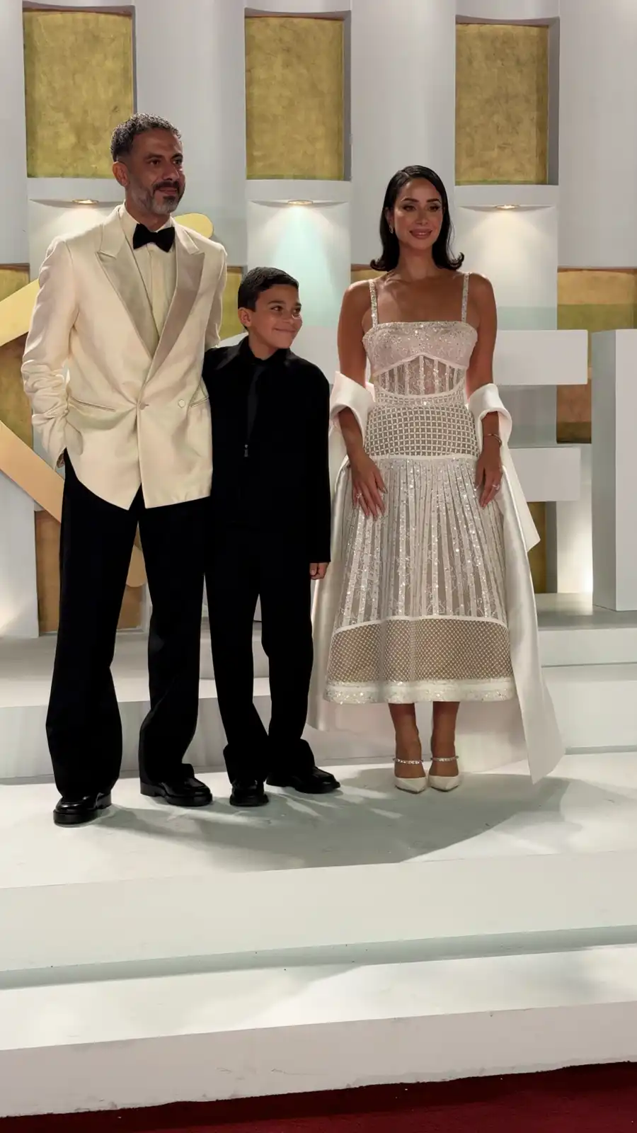 حضرا كثنائي على السجادة الحمراء بإطلالة متناسقة، فقد اختار خالد بدلة سوداء أنيقة مع قميص مفتوح الرقبة أضفى لمسة عصرية وجذابة، فيما تألّقت زوجته بفستان أبيض ناعم تزيّنه كشاكش من منطقة الصدر، ما منحها حضورًا أنثويًا لافتًا يُكمل أناقة زوجها الهادئة.