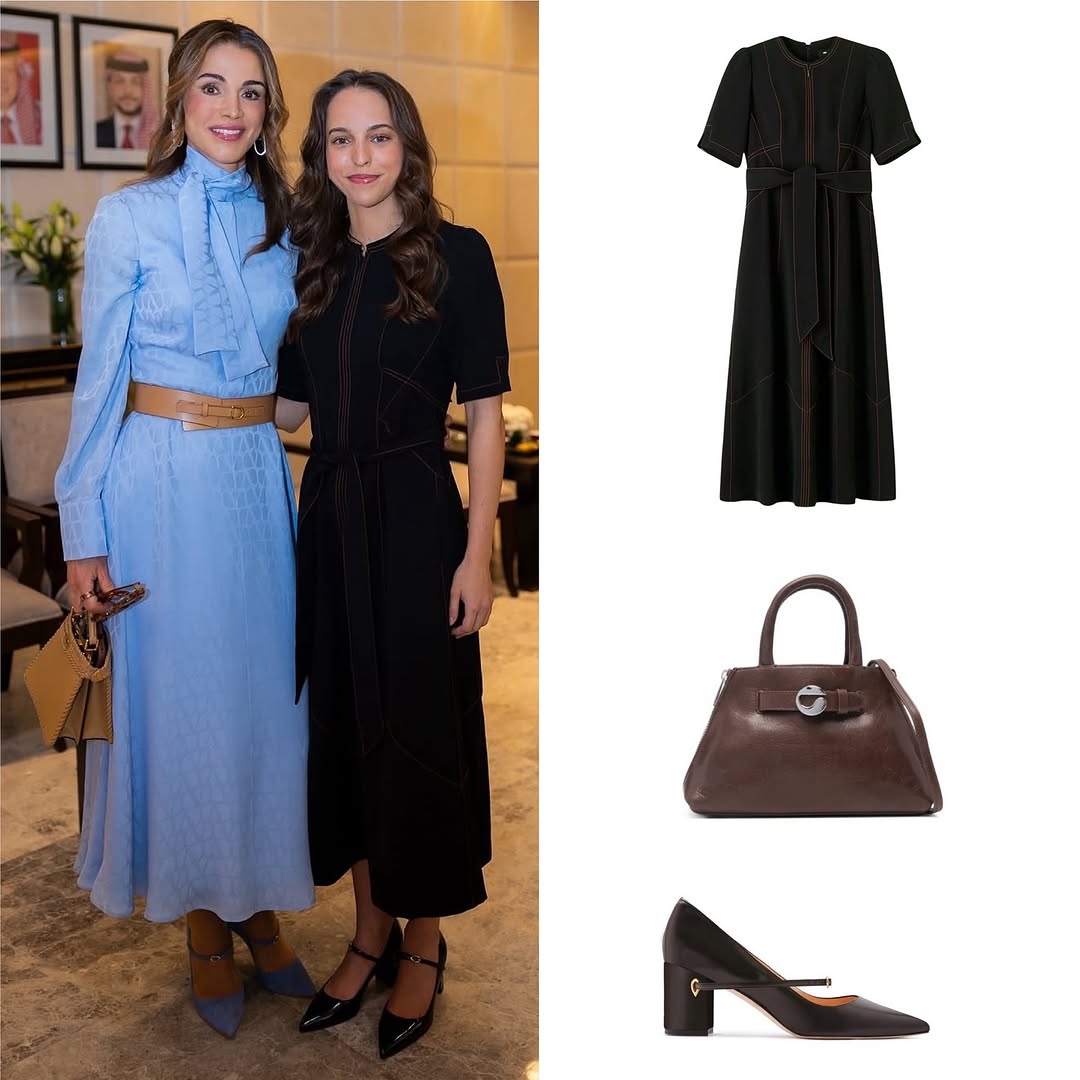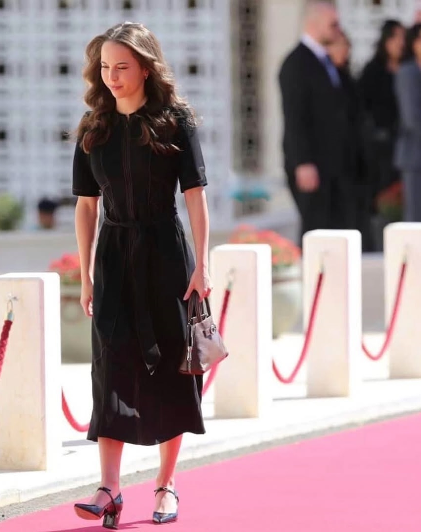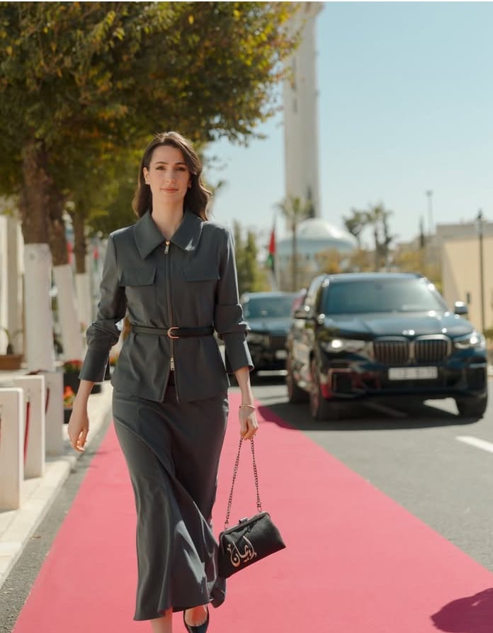 أكملت الأميرة رجوة إطلالتها بإكسسوارات فضية رفيعة، وحذاءٍ أسود بكعبٍ متوسط، وحقيبة يدّ أنيقة تحمل اسم ابنتها “إيمان”، في لفتةٍ أنثوية تعبّر عن الحنان الملكي بلغةٍ راقية.