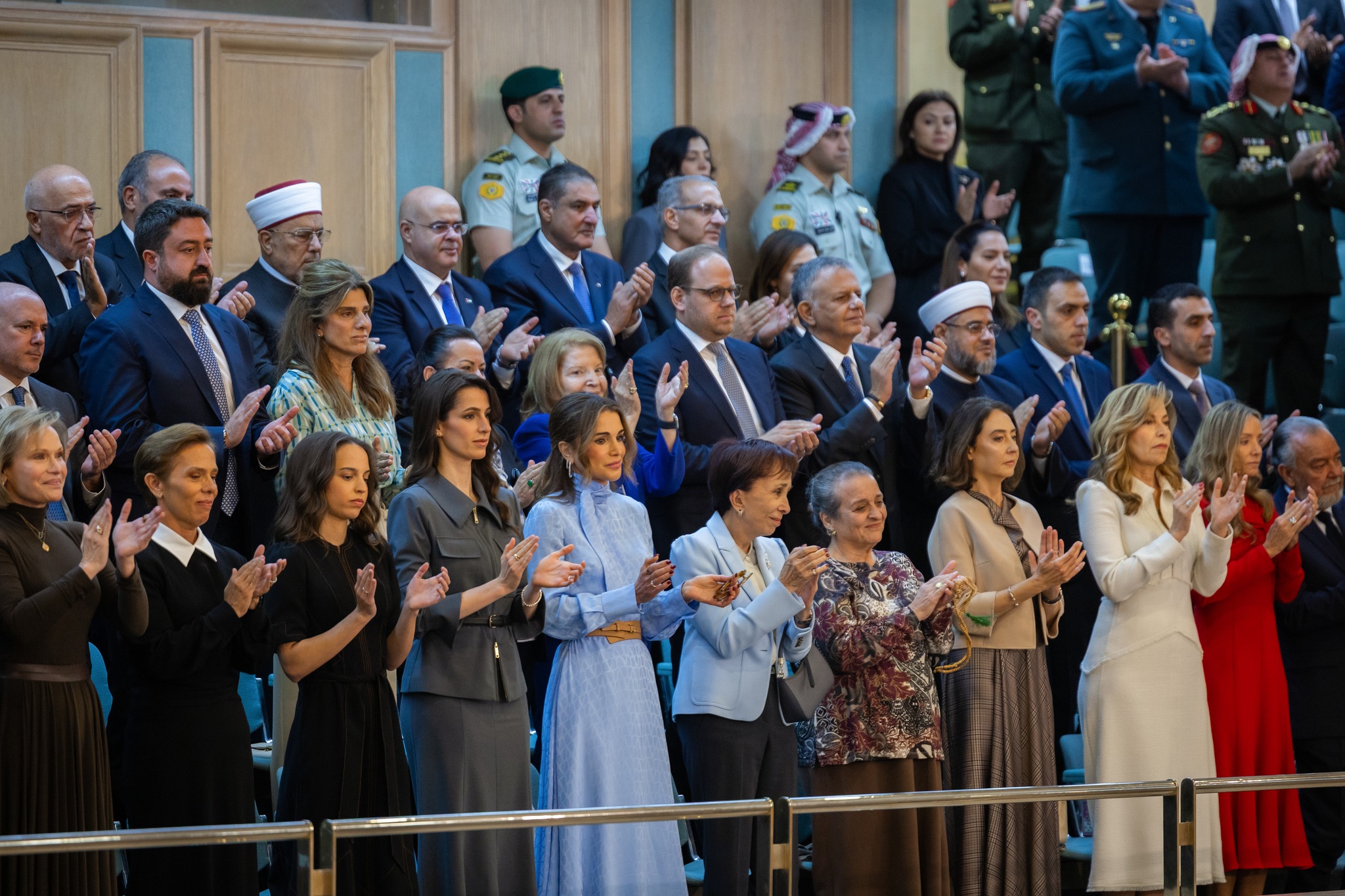 تقدّمت الملكة رانيا العبد الله المشهد بإطلالةٍ ساحرة باللون الأزرق السماوي، لتكرّس مرّة أخرى صورتها كأيقونة للأناقة الملكية الحديثة، فيما شاركتها الأميرة رجوة الحسين والأميرة سلمى حضورًا أنيقًا لا يقلّ رصانةً عن المراسم نفسها.