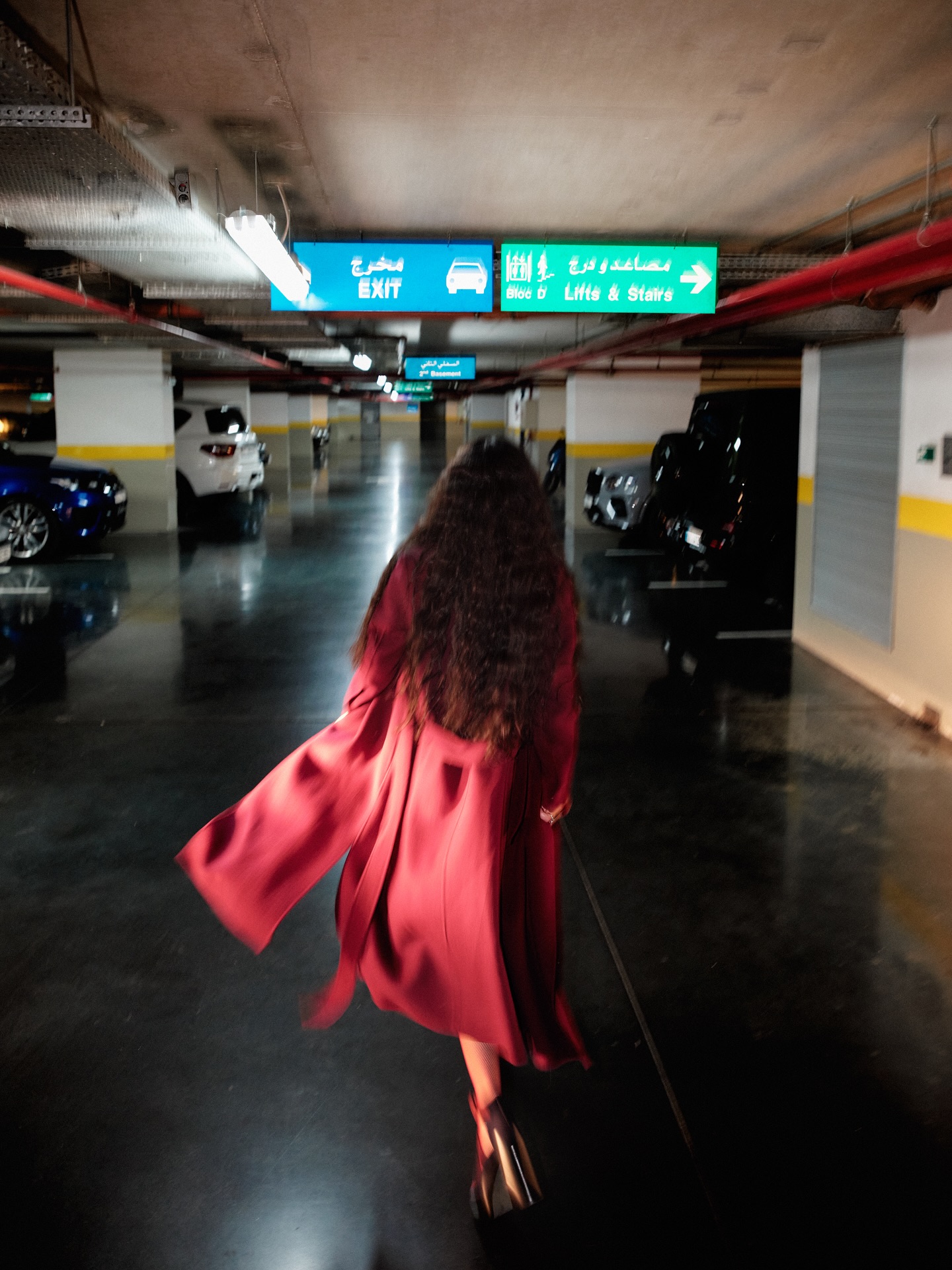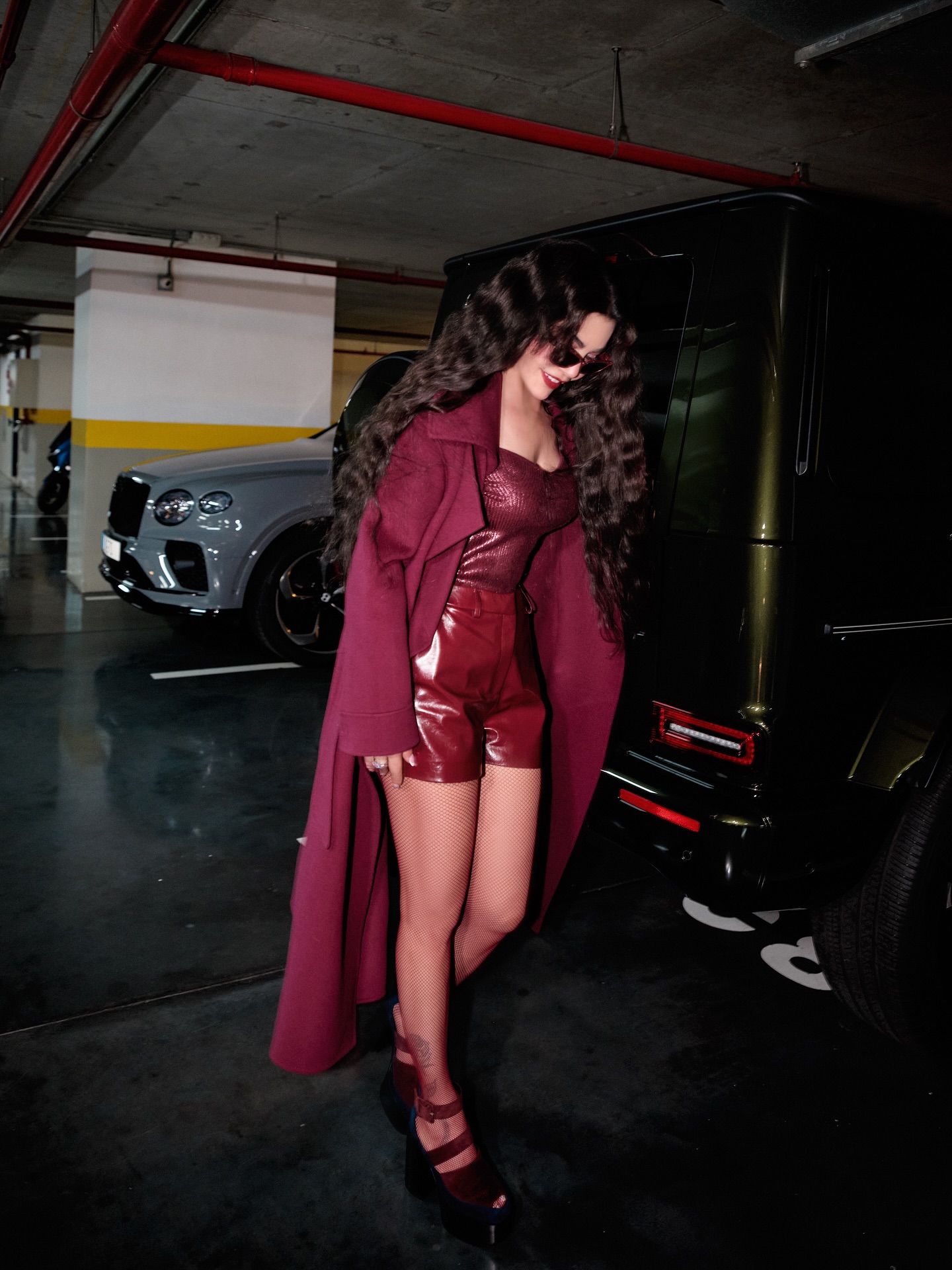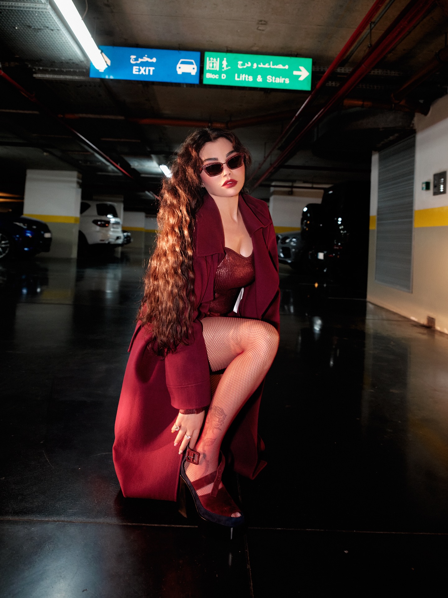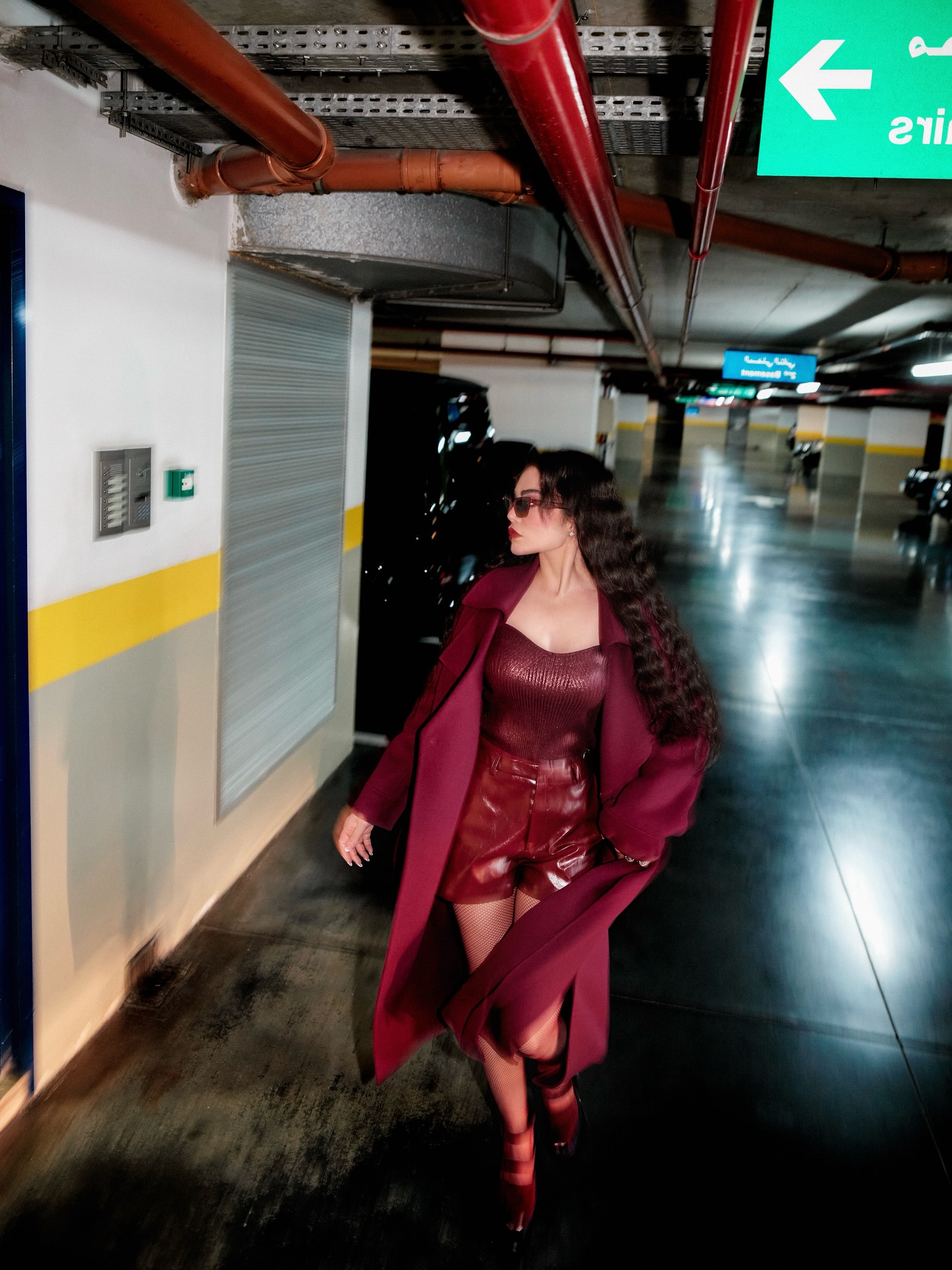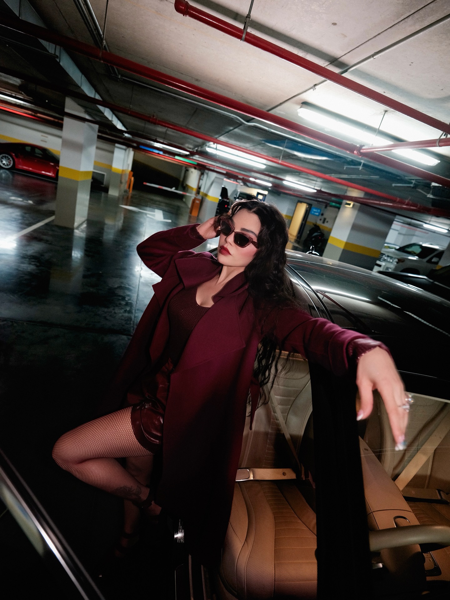 في أحدث جلسة تصوير لها داخل مرأب السيارات، اختارت اللون الخمري الدافئ، لوناً يوازي الغموض والدفء معاً، لتقدّم صورة امرأة تمسك بزمام حضورها، تشدّ حذاءها وتعدّ نفسها للانطلاق، كما لو أنها تستعدّ لمواجهة الحياة بموسيقى خطواتها.