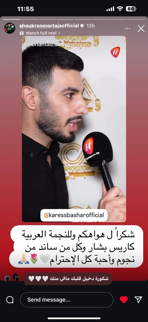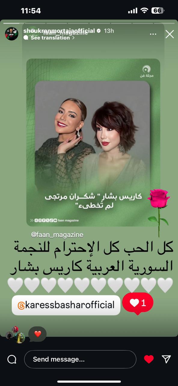 وجهت الممثلة السورية شكران مرتجى عبر حسابها على منصة "انستغرام" رسالة شكر لكل من هواكم والممثلة كاريس بشار التي دعمتها في رسالة مباشرة لدى سؤالها عن الحملة التي تتعرض لها شكران.