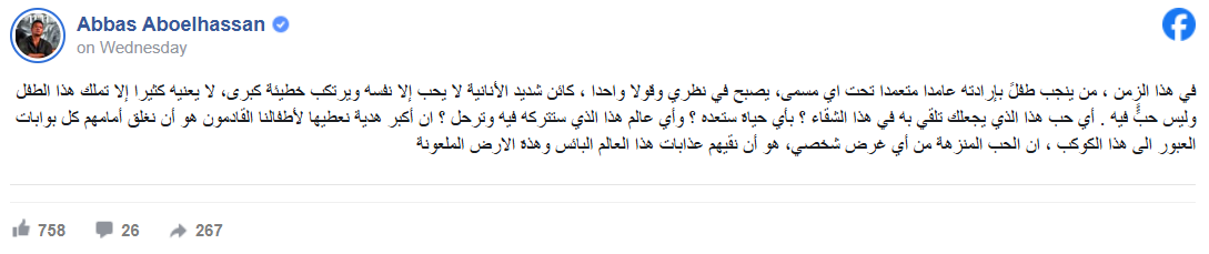 وقال أبوالحسن في منشور على فيسبوك: "في هذا الزمن، من ينجب طفلاً بإرادته عامداً متعمداً تحت أي مسمى، يصبح في نظري كائناً شديد الأنانية لا يحب إلا نفسه ويرتكب خطيئة كبرى".