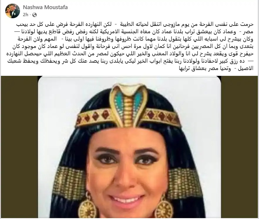 قالت نشوى مصطفى في منشور مؤثر عبر حسابها في منصة "فيسبوك": حرّمت على نفسي الفرح من يوم ما زوجي انتقل لحياته الطيبة، لكن النهارده الفرحة فرض على كل حد بيحب مصر. عماد كان بيعشق تراب بلدنا، رغم إنه كان معاه الجنسية الأمريكية، لكنه رفض رفضًا قاطعًا يديها لولادنا، وكان دايمًا بيقول لي إن بلدنا أولى بينا مهما كانت الظروف.