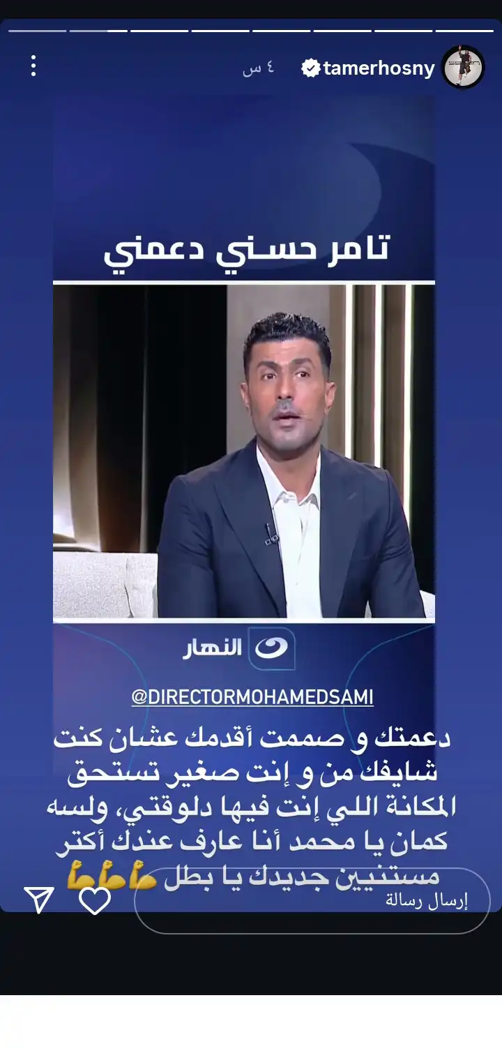 ونشر تامر حسني عبر خاصية "ستوري" على حسابه الرسمي بموقع "إنستغرام"، قائلًا: دعمتك وصممت أقدّمك عشان كنت شايفك من وإنت صغير تستحق المكانة اللي أنت فيها دلوقتي، ولسه كمان يا محمد، أنا عارف عندك أكتر.. مستنيين جديدك يا بطل".