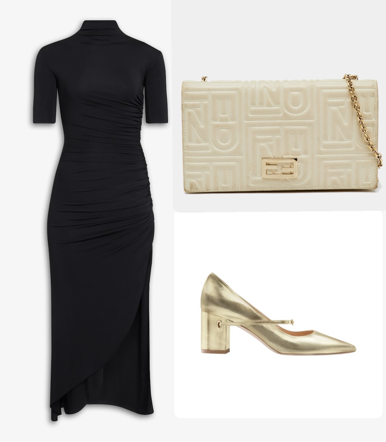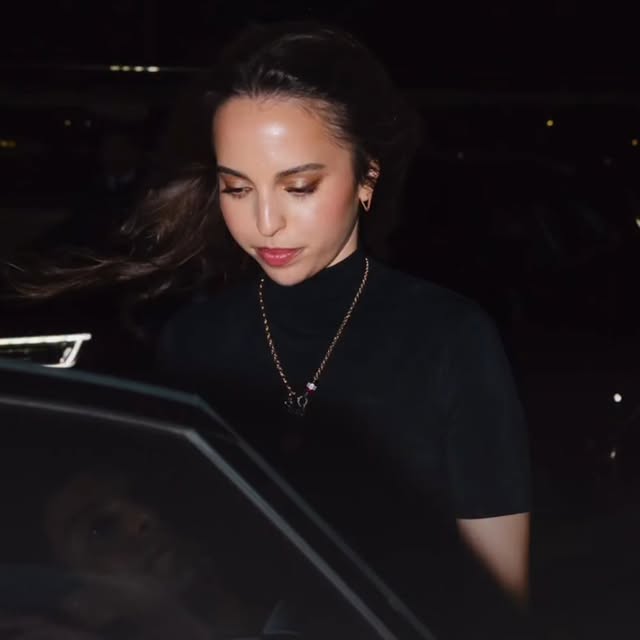 واكتمل الحضور مع حقيبة صغيرة من Fendi بلون بيج ذهبيّ ونقشةٍ منقوشة بتفاصيل معدنية، وحذاءٍ جلدي ذهبيّ بكعبٍ متوسط من Jennifer Chamandi، ليعكس المزيج الذهبي والأسود توازنًا بين الرقيّ والحداثة.