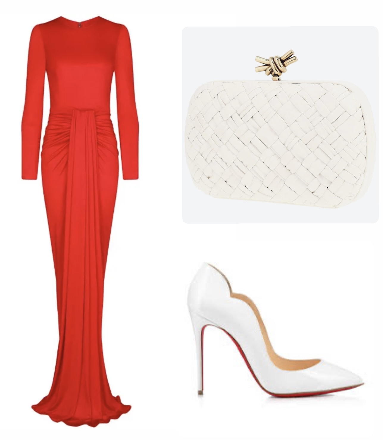 نسّقت الإطلالة مع حقيبة "كلاتش" بيضاء من Bottega Veneta، بحياكةٍ متشابكة تليق بفخامة المناسبة، وانتعلت حذاءً أبيض كلاسيكيًا بكعبٍ عالٍ من Christian Louboutin، ليكتمل المشهد بتوازنٍ بين الجرأة والدقّة.