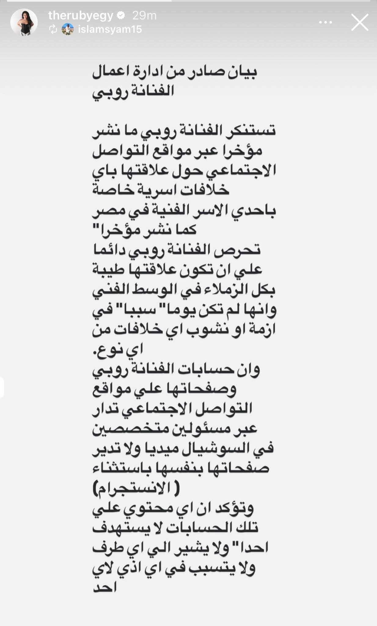 أصدرت إدارة أعمال الفنانة روبي بيانًا رسميًا ردًا على ما تم تداوله مؤخرًا عبر مواقع التواصل الاجتماعي بشأن ارتباط اسمها بخلافات أسرية تخص إحدى الأسر الفنية في مصر.