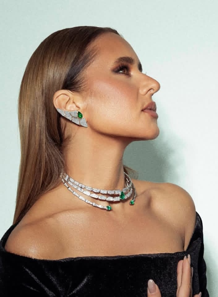 أما المجوهرات… فكانت جواهر خضراء تلمع كقطرات ندى على ورقة ياسمين ليلي.لم تكن مجرد إكسسوارات.