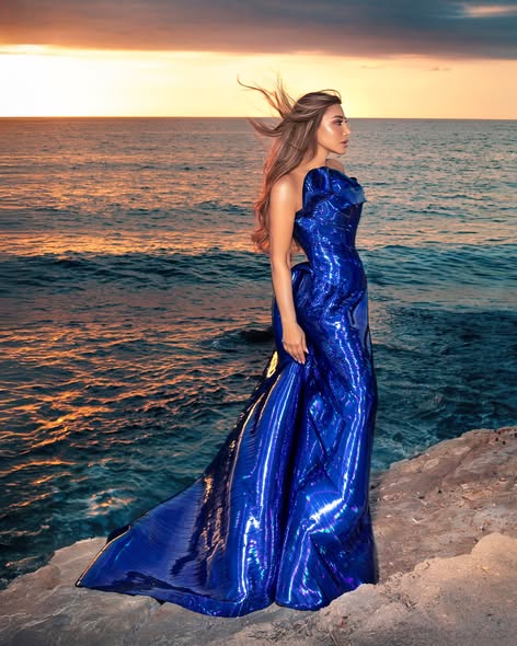 الثوب بقصّة الكتف الواحد جاء بانسياب يشبه حركة الأمواج، وقماشه اللامع يعكس الضوء كما لو أنه يلتقط أنفاس البحر ويعيدها بريقاً على جسدها.