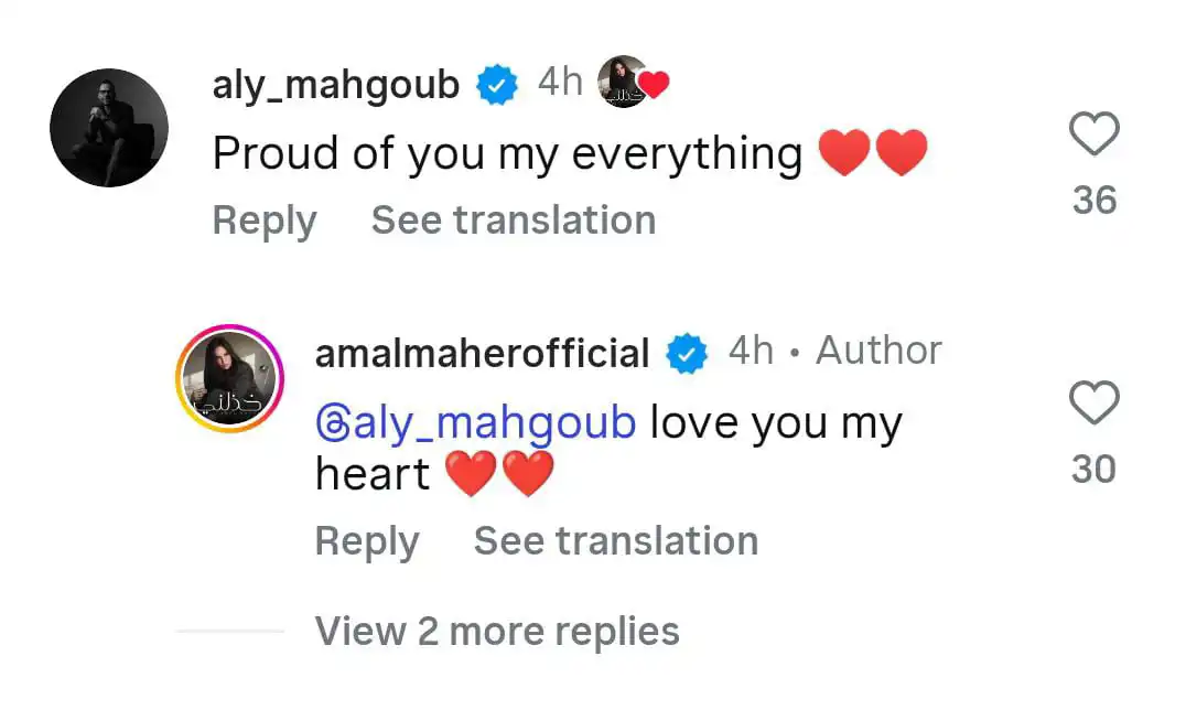 جاءت المفاجأة بعد تعليق علي محجوب على أحدث صور آمال ماهر عبر حسابها الرسمي في إنستغرام، حيث كتب: "فخور بكِ يا كل شيء بالنسبة لي".