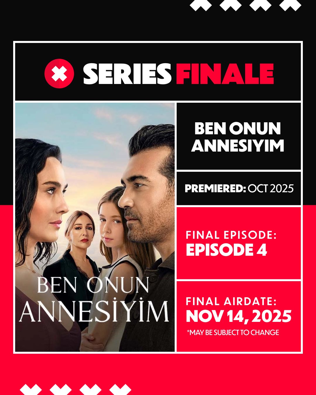 أعلنت منصة NOW TV رسميًا عن توقف عرض المسلسل التركي الجديد "Ben Onun Annesiyim" (أنا أمها) عند الحلقة الرابعة، بسبب انخفاض نسب المشاهدة التي لم تحقق التوقعات منذ انطلاقه في 24 أكتوبر/تشرين الأول.