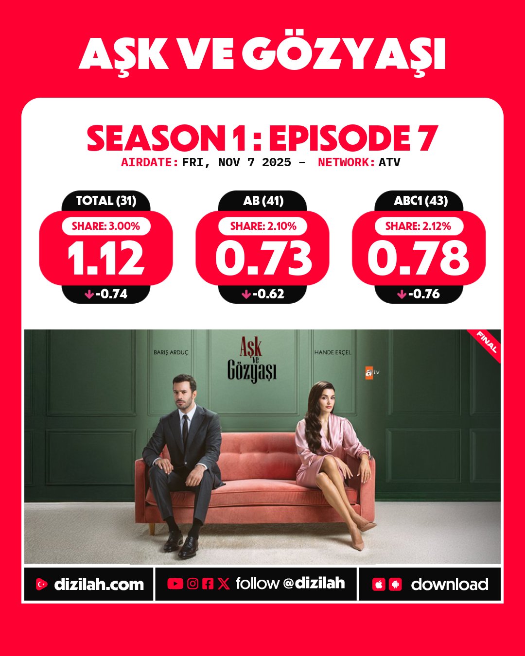 سجّلت الحلقة السابعة من "Aşk ve Gözyaşı" أرقامًا مخيبة للآمال، حيث بلغت نسبة المشاهدة الإجمالية (Total) 1.12 بنسبة مشاركة 3.00% بانخفاض 0.74 نقطة عن الحلقة السابقة. في فئة AB حقق المسلسل 0.73 بنسبة مشاركة 2.10%، فيما بلغت فئة ABC1 نسبة 0.78 بنسبة مشاركة 2.12%، مع تراجع تجاوز النصف في جميع الفئات. هذه النتائج وضعت العمل في مرتبة متأخرة بين البرامج المنافسة، ما جعل قرار الإنهاء حتميًا.