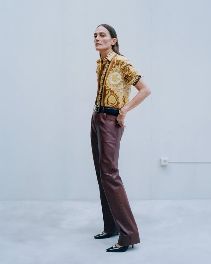 Versace: دمج اللون البني مع التطريزات الذهبية والخامات الراقية ليظهر بمظهر جذاب وفخم.