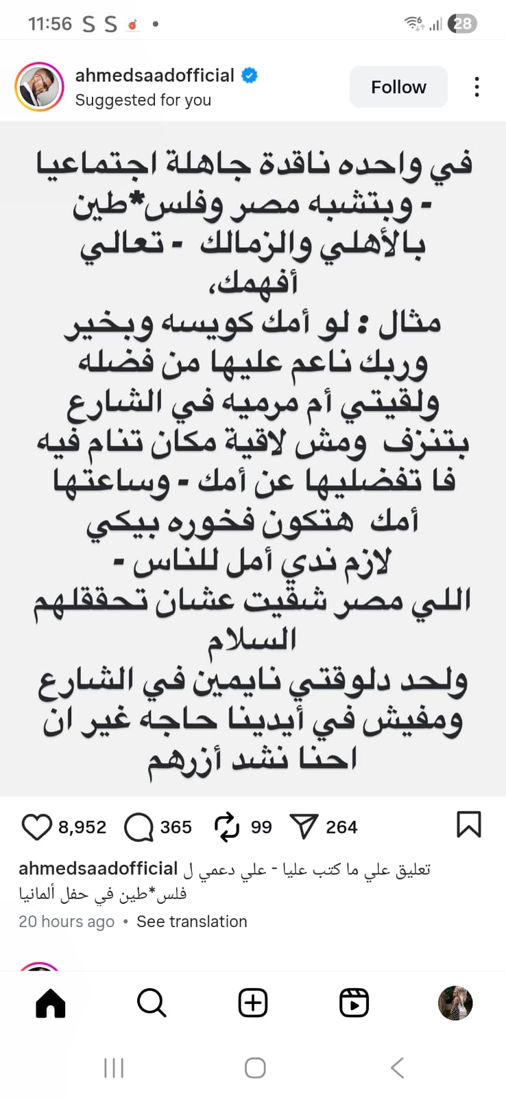 وعبر ستوري حسابه على انستغرام، كتب أحمد سعد: "في واحده ناقدة جاهلة اجتماعيا - وبتشبه مصر وفلسطين بالأهلي والزمالك - تعالي أفهمك، مثال : لو أمك كويسه وبخير وربك ناعم عليها من فضله ولقيتي أم مرميه في الشارع بتنزف ومش لاقية مكان تنام فيه فا تفضليها عن أمك - وساعتها أمك هتكون فخوره بيكي لازم ندي أمل للناس - اللي مصر شقيت عشان تحققلهم السلام ولحد دلوقتي نايمين في الشارع ومفيش في أيدينا حاجه غير ان احنا نشد أزرهم"